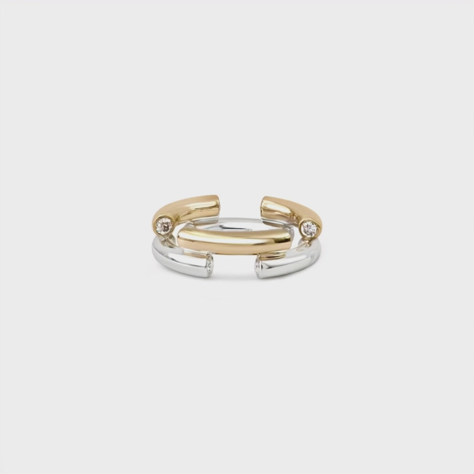 The warm glow of gold and the cold elegance of silver come together in a single form in Équilibre. The contrast of two different metals gives this ring both strength and serenity. The piece, which draws attention with its modern design, manages to be both simple and assertive at the same time.