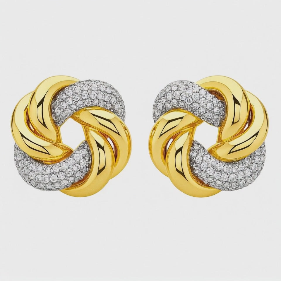Carrying elegance and power together, Glimvault Earrings combine the dazzling magnificence of golden tones with curves adorned with stones. Its knot-shaped design represents both devotion and timeless elegance.