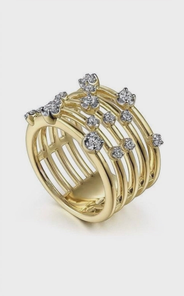 Strates d'Orion takes its name from the sky's most striking constellation—and it takes center stage on your finger. Five golden bands rise one above the other in a perfect alignment reminiscent of Orion's belt, while on each band, freed diamonds flicker like stars floating in space. The stones are not symmetrical; they are distributed like unintentionally dropped cosmic sparks, so that with each turn of the ring, a whole new galaxy erupts. The wide inner curve, despite its voluminous body, offers an unexpected comfort—it evokes luxury, but never obstructs it.