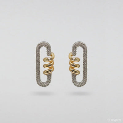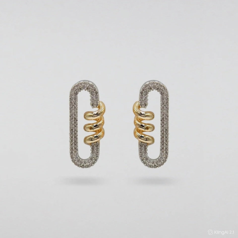 The Twinxel Earrings are a signature piece that embodies the energetic rhythm of modern design. Oval forms surrounded by sparkling stones are enhanced by a double gold spiral at the center, creating both movement and depth. They reflect the perfect harmony of two opposing elements: geometric balance and organic curves.