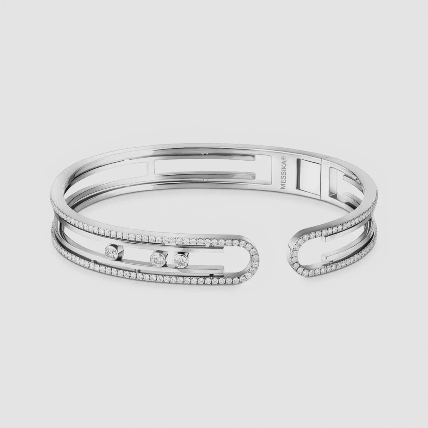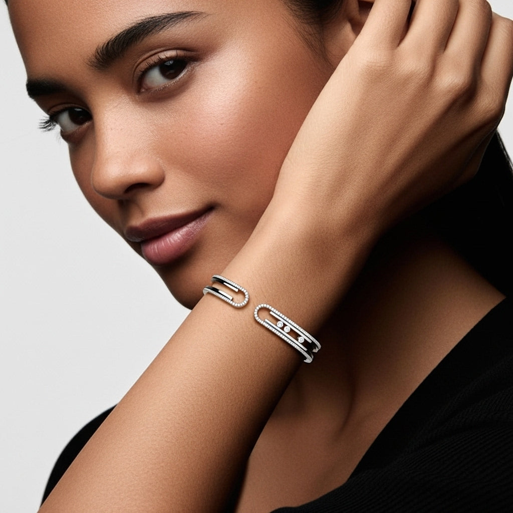 Aperture Kelepçe, bileği saran iki ince hat üzerinde döngüsel uçlarla tamamlanan mimari bir siluet sunar. Dış çerçevedeki mikro pavé çizgi kesintisiz bir ışıltı verirken, iç ray üzerindeki serbest hareketli pırlantalar ışıkla birlikte kayar ve her hareketinizde canlı bir parıltı üretir. Parlak beyaz altın yüzey, zarif açıklık formu sayesinde hafif ve konforlu bir kullanım sağlar; tek başına net, katmanlandığında iddialı bir ifade. Minimal çizgi, yüksek etki: Aperture.