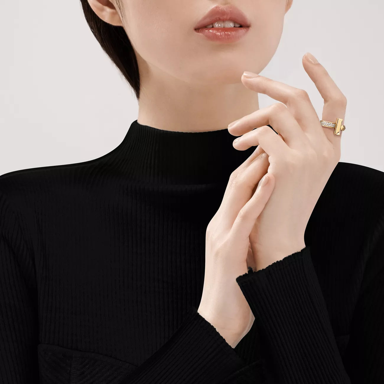 Apex Line Yüzük, keskin hatlı prizmatik barın bantı çapraz kesmesiyle mimari bir siluet sunar. Bir yüzey tamamen ayna parlaklığıyla yalın, diğer yüzey pavé taşlarla yoğun ışıltı verir; asimetrik kurgu modern bir kontrast yaratır. Düşük profilli gövde parmakta dengeli durur ve gün boyu konfor sağlar. Tek başına net bir odak, ince bantlarla eşlendiğinde güçlü bir stack etkisidir.