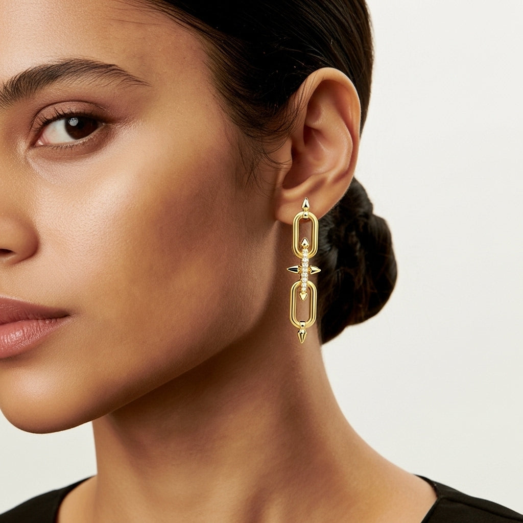 Güçlü çizgileri ve iddialı formuyla öne çıkan Aurelia Blade Küpe, altın tonlu gövdesi ve sivri uçlu detaylarıyla modern bir cesareti yansıtır. Orta kısımda parıldayan taş sırası, tasarıma zarif bir ışıltı katarken zincir formundaki yapı güçlü ve sofistike bir duruş sunar. Hem gece şıklığında hem de günlük kombinlerde fark yaratmak isteyenler için ikonik bir seçimdir.