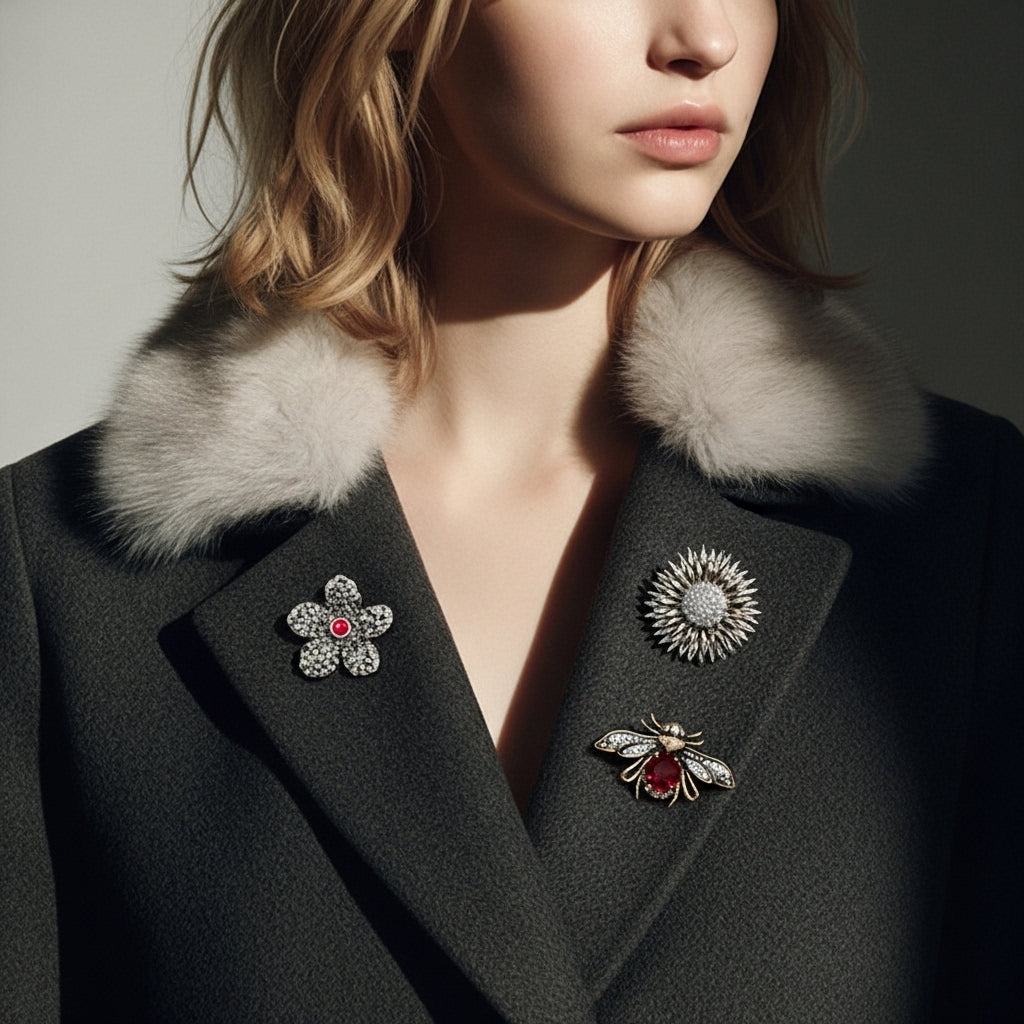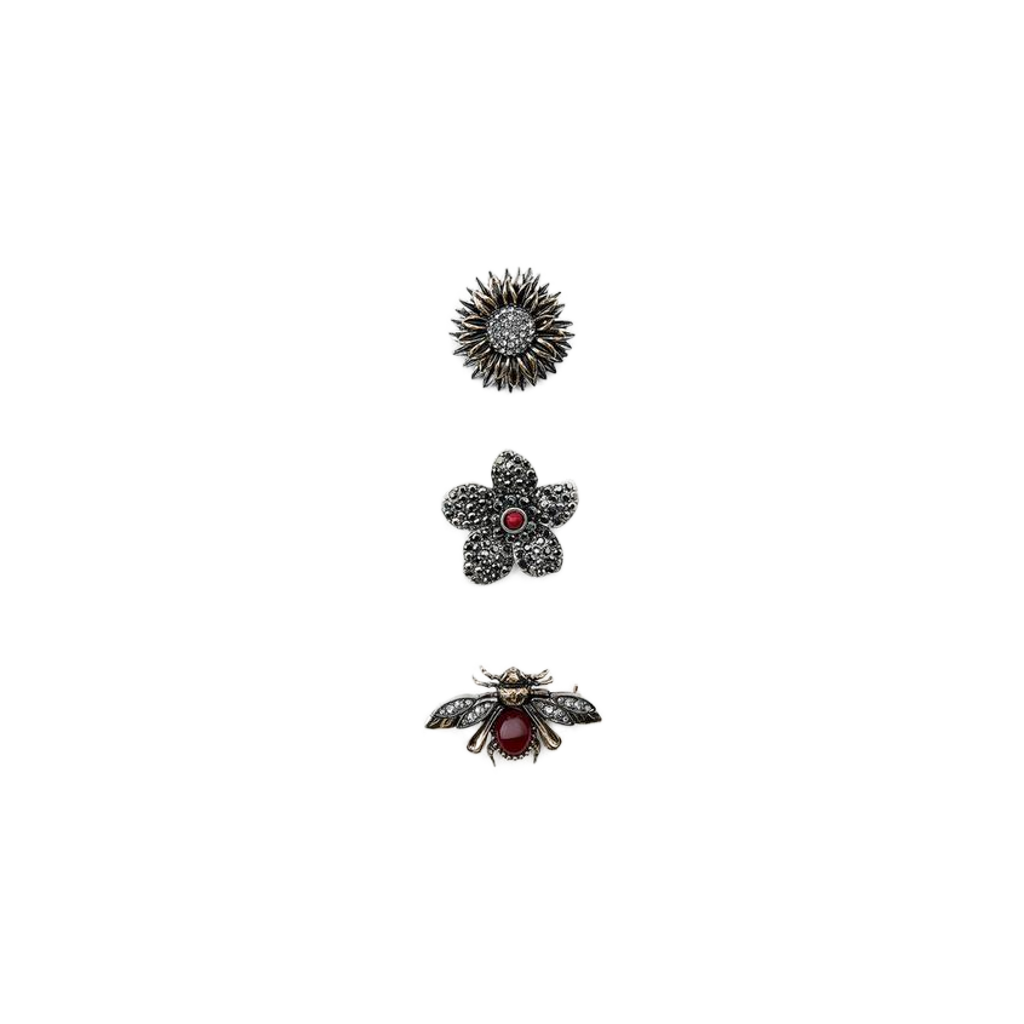 Blossom & Bee Broş, okside koyu tonda pavé taşlı çiçek ve arı motiflerinden oluşan üç parçalı bir settir. Mikro taş dokuları yüksek parlaklık üretir, kırmızı merkez taşlar kompozisyona vurgu ekler. Ceket yakası, triko ve şal üzerinde tek tek sade; birlikte takıldığında karakterli bir koleksiyon etkisi verir. Zamansız ve net.