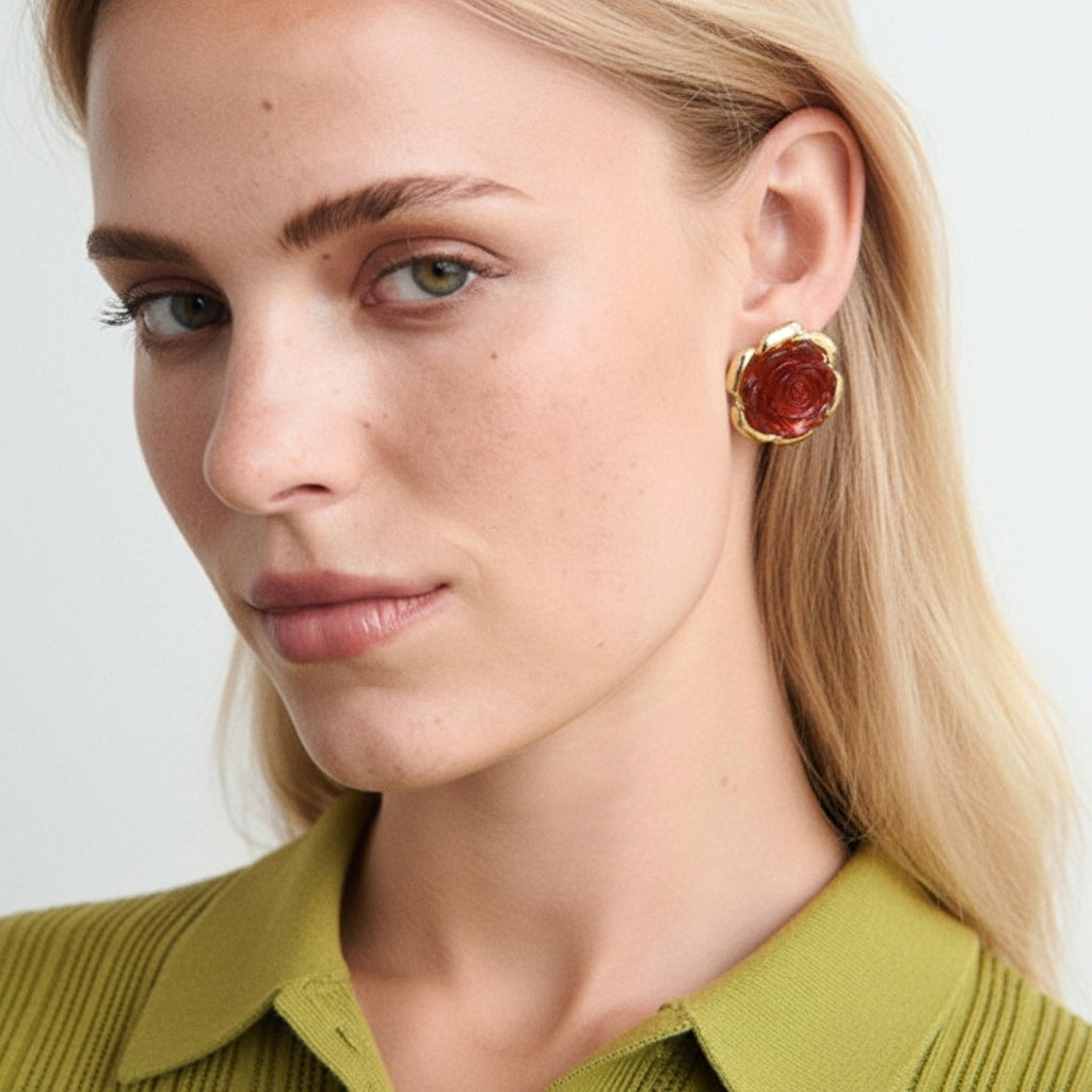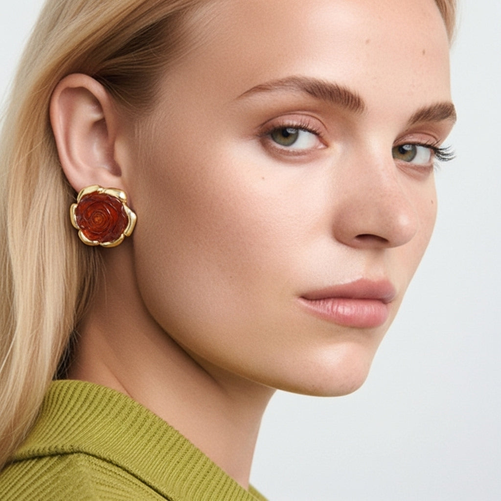 Bronze Petal Küpe, el oyması etkili altın ton gövdeye yerleştirilen bronz-kehribar cam kabartısıyla heykelsi bir siluet sunar. Kabarık çiçek formu kulakta dengeli durur, ışıltılı yüzey her harekette sıcak bir parıltı verir. Günlük trikolardan akşam elbiselerine kadar tek parçada güçlü bir odak oluşturur. Zamansız ve net.