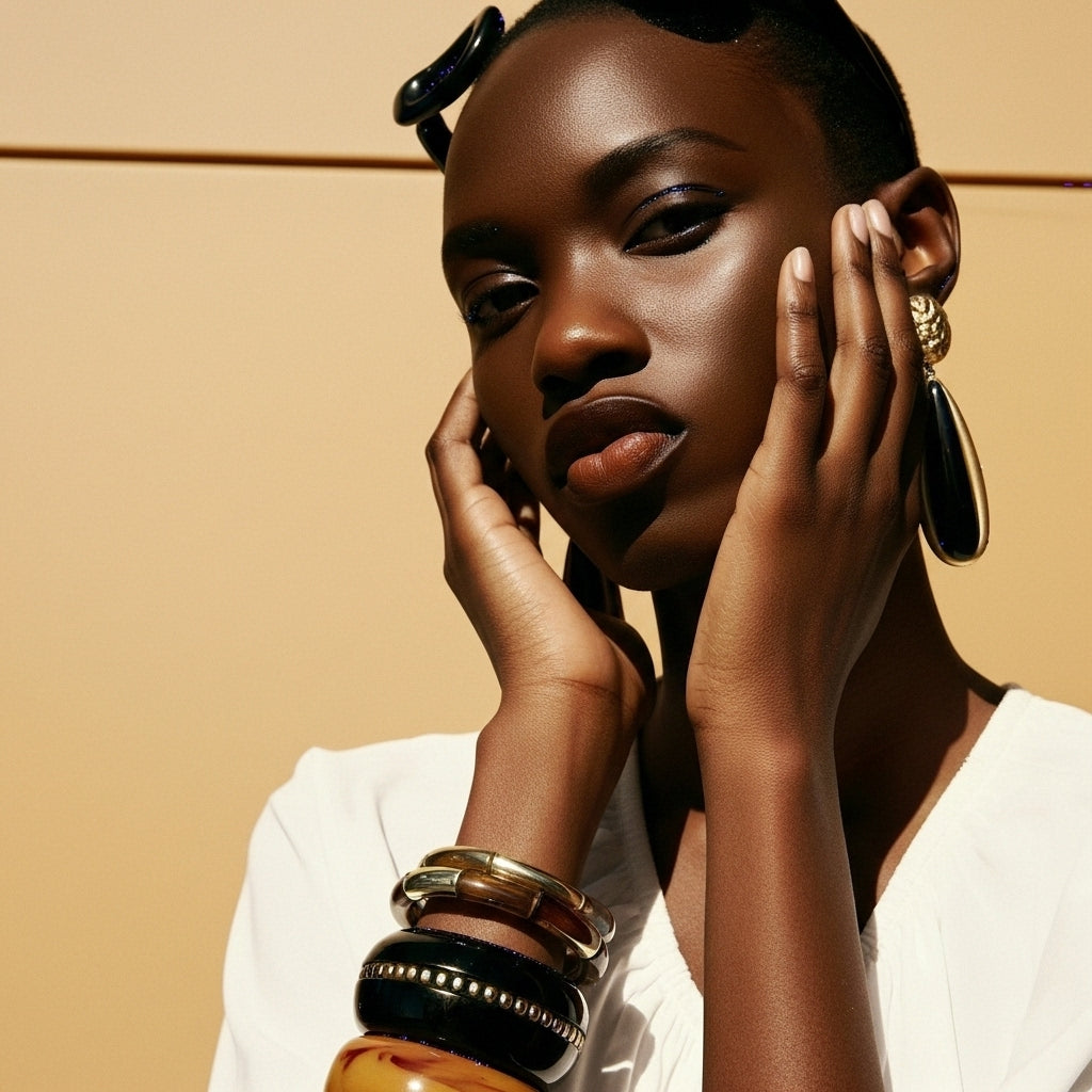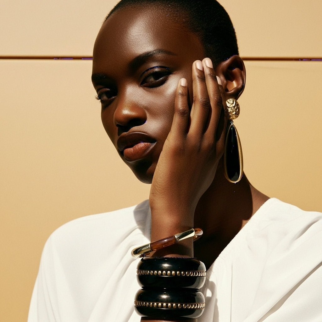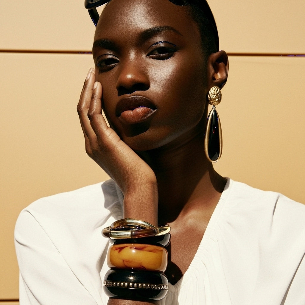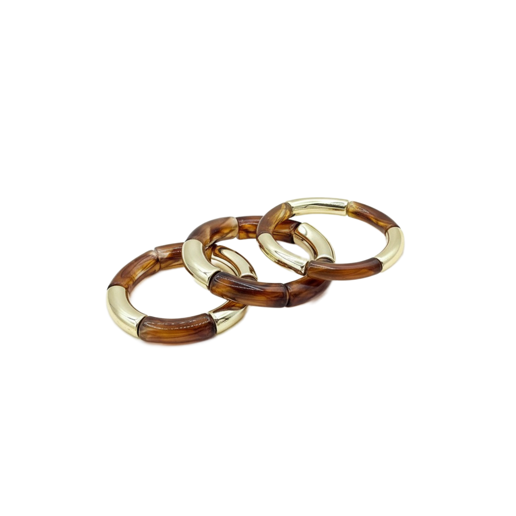 Cognac Bamboo Bileklik, şehir ışıklarının sıcaklığını taşıyan konyak-tortoise dokusunu pürüzsüz altın tonlu halkalarla birleştirir. Bambudan ilham alan segmentli formu bileğe temiz bir hat verir; tek başına minimal bir vurgu, birden fazla bileklikle yan yana kullanıldığında güçlü bir “stack” etkisi yaratır. Gün boyu hafif ve konforludur, ofisten gece stiline kesintisiz geçiş yapar.