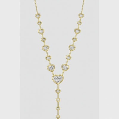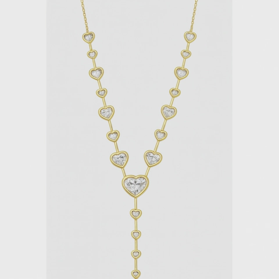 Y şeklindeki formu, boyun hattını zarifçe uzatırken göğüs üzerine düşen taşlı bölümle feminen bir çekicilik yaratır. Hareket ettikçe ışığı yakalayan kalp taşlar, her bakışta farklı bir parıltı sunar.