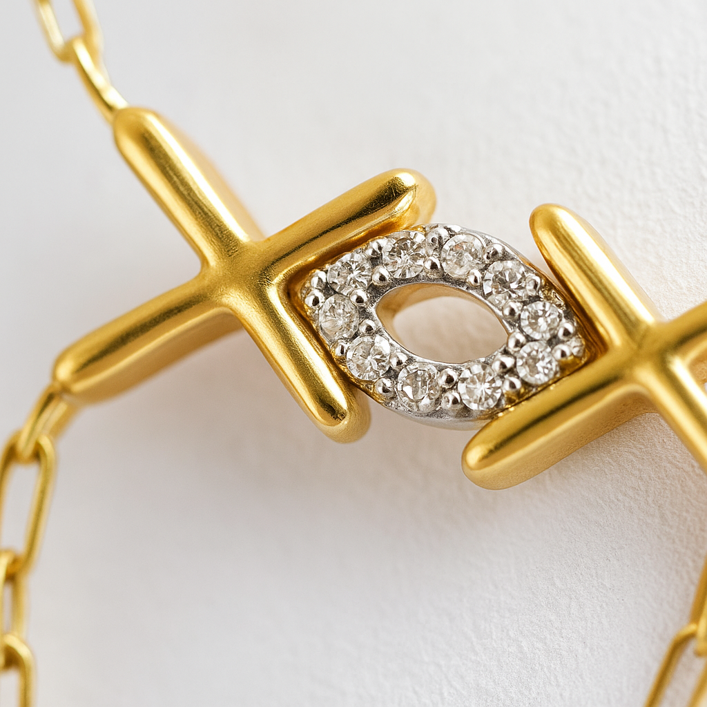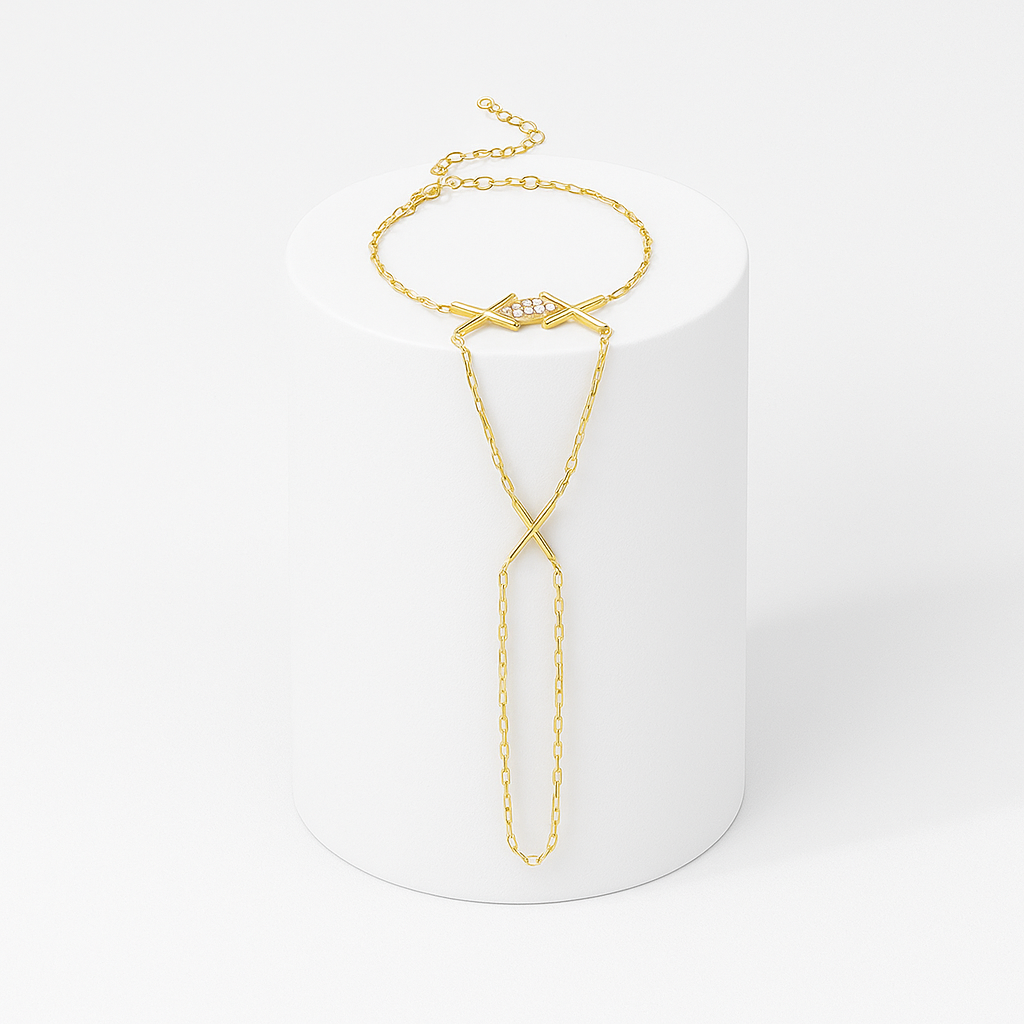 Keskin “X” formundaki ikiz köprüler, bileğinizin tam üzerinde geometrik bir taç gibi buluşuyor; ortadaki berrak taş kümesi ışığı yakalayıp tek noktada yoğunlaştırıyor. Zincirin aşağı doğru daralan üçgen silueti, elinizin doğal hatlarını izleyerek parmak halkasına kadar uzanıyor ve her hareketinizde kesintisiz bir altın izleği oluşturuyor. Tasarımın mimari netliği süs değil karakter taşıyor: fazlalıksız çizgiler, gerek ofis gri tonlarına gerek gece elbisesinin ipeğine aynı özgüveni yansıtıyor. Ayarlanabilir kilit sistemi gün boyu stabil kalıyor, hafif konstrüksiyon ise takıyı “varlığını unutturan” konfora taşıyor. Crosslink Radiance, elinizde gözle görülür bir odak noktası yaratmak için fazla söze ihtiyaç duymayan, yapısal ama akışkan bir imza parçası.