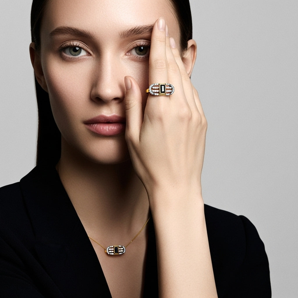 Oval formlu kafes üst yapısı ve ortadaki siyah dikdörtgen taşla tasarlanan Deco Cage Yüzük, art deco mimarisinden ilham alan çizgisel bir görünüm verir. Üst bölümdeki üçlü pavé şerit ışığı eşit dağıtır, siyah taş ise tüm bakışı merkeze toplar. Altın tonlu sade gövde sayesinde elde ağır durmadan premium bir etki yaratır. Tek başına kullanıldığında statement parça olur, diğer altın yüzüklerle birlikte takıldığında koleksiyon havası verir.