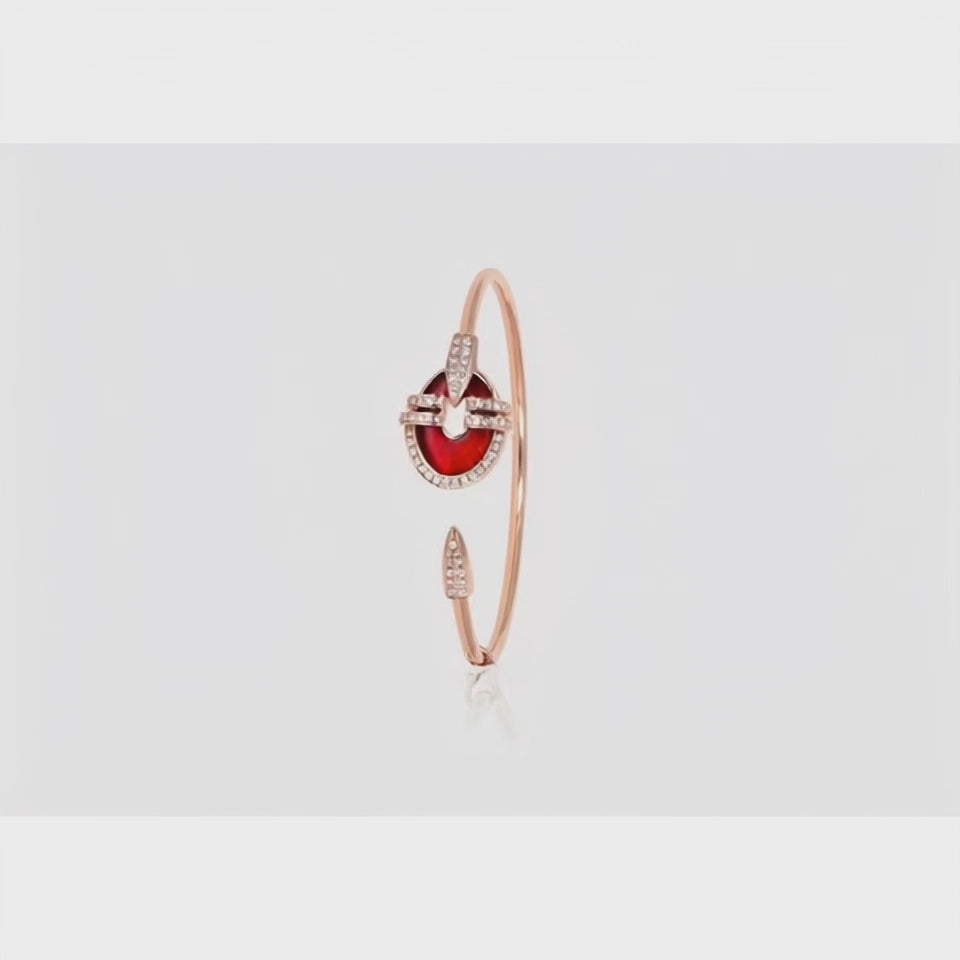 Égide Kelepçe, bileğe kalkan gibi sarılan ince yayını merkezde iki farklı ruhla buluşturur. Verdoyante versiyonunda derin zümrüt yeşili, pavé elmas halesiyle yan yana durunca orman sessizliğinde yankılanan serin bir nabız yaratır; Incandescente versiyonunda ise yakut kırmızısı aynı çerçevede kıvılcımlanan, tavizsiz bir tutkuyla parlar. İki rengin de özünde aynı mimari var: taşın bombeli yüzeyi ışığı içine çekip çoğaltırken, onu saran elmas kemer her harekette ince çizgi hâlinde kıvılcım saçıyor. Uçtaki elmas miğferler klik sesiyle kapanarak kişisel bir ritüeli tamamlarken, bileğin iç kısmındaki ipeksi kavis hacimli tasarıma beklenmedik bir konfor katıyor. Kısacası Égide, zıt karakterleri tek bedende taşıyanların kelepçesi—yeşilin dingin öz güveni ya da kırmızının ateşli kararlılığı; hangisini seçerseniz seçin, ışığı zırh gibi kuşanıyorsunuz.