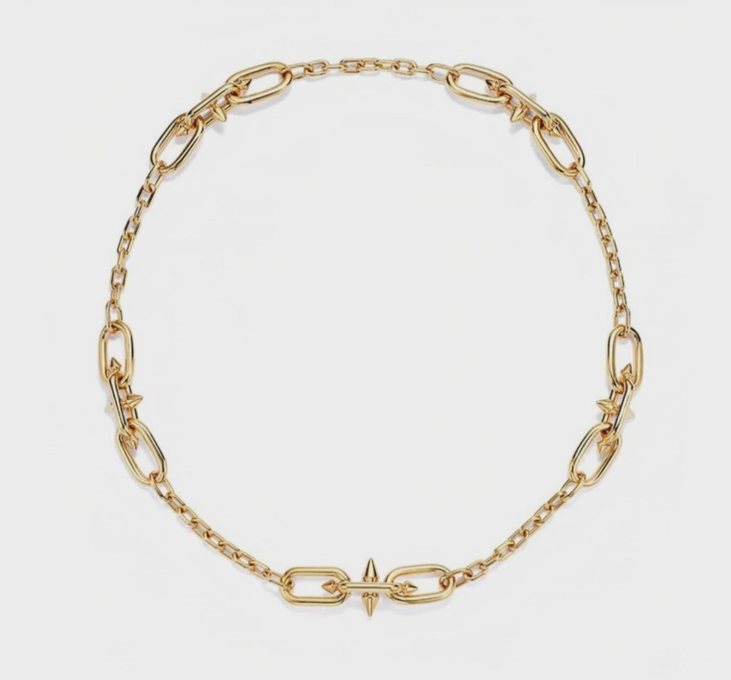 Fierro Luxe Kolye, modern zincir halkalarını sivri detaylarla buluşturan güçlü bir tasarıma sahiptir. Altın tonunun parlaklığı ve geometrik formların keskinliği, boynunuzda dikkat çeken bir siluet oluşturur.