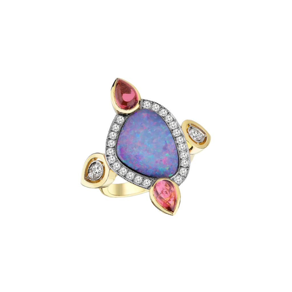 Fleur d’Opale Yüzük, merkezdeki canlı oyunlu ışıltısıyla dikkat çeken iri opali, ince pavé elmas bir hale ile çerçeveler; çevresine asimetrik yerleşen damla kesim pembe tonlu taşlar ve minik elmas damlalar kompozisyona dinamik bir akış katar. Yumuşak kubbeli başlık profili ve parlak cilalı altın gövde, opalin mavi-menekşe parıltılarını sıcak bir zemin üzerinde yükseltirken, el işçiliği milimetrik pençeler taşların hacmini öne çıkarır. Işığı her açıdan yakalayan bu heykelsi form, tek başına güçlü bir imza etkisi yaratır; zamansız mücevher kodlarını çağdaş bir renk hikâyesiyle birleştiren sofistike bir statement parçadır.