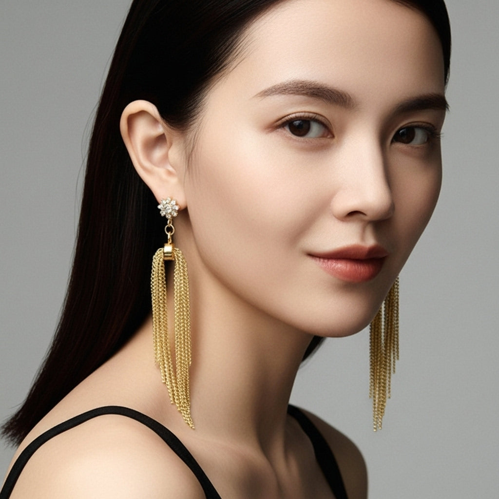 Flora Tassel Küpe, pavé çiçek başlığın zarif ışıltısını ince zincir saçakların akışkan hareketiyle buluşturarak yüz hatlarını uzatan, sahnede parlayan modern bir siluet sunar. Altın tonlu gövde ve çoklu zincirlerin ritmi her adımda ışığı çoğaltır; minimal bir elbisede tek başına güçlü bir odak, blazer ve ipek gömleklerde şık bir final dokunuşu olur.