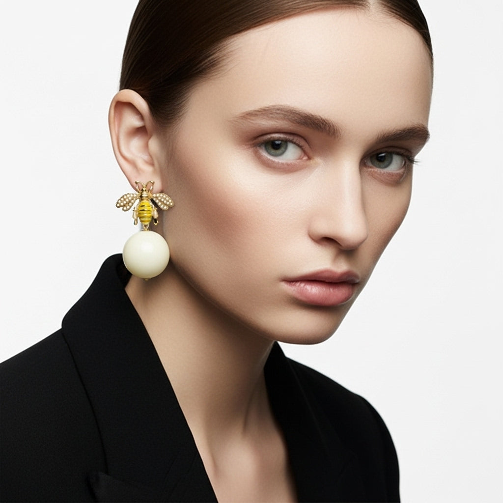 Gilded Bee Küpe, kabartmalı arı motifi ve kusursuz parlaklıktaki küre drop’un kontrastından güç alan, dikkat çekici ve rafine bir siluet sunar. İnce işçilikli kanatlar mikro ışıltıyla konturlanır; şeffaf sarı gövde vurgusu “honey-gold” bir sıcaklık katar. Alttaki yüksek parlaklıkta küre, formu dengeleyerek bakışı tek noktada toplar ve her açıdan net bir yansıma üretir. Sonuç: öz güvenli, ikonik ve fotoğrafta olduğu kadar gerçek ışıkta da etkileyici bir imza parça—tek dokunuşla görünümü yükseltir.