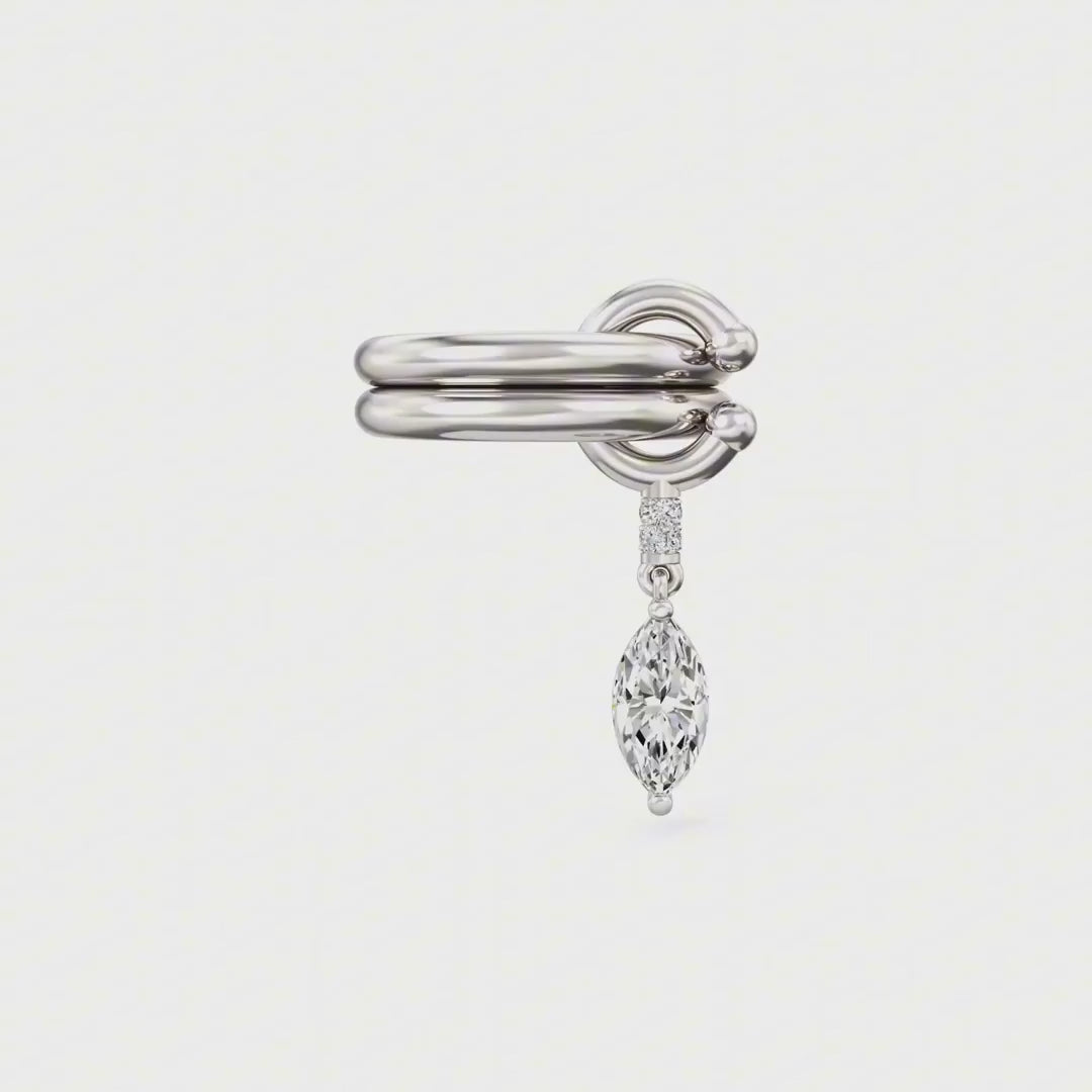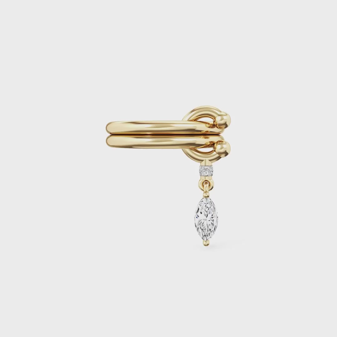 Kulak hizasında zarifçe sarılan altın tonlu formu ve ucundan süzülen parlak taş detayıyla akışkan, feminen ve modern bir vurgu yaratır. Küpe deliği gerektirmez; tek başına takıldığında bile kulağa “styled” bir görünüm verir, diğer halkalarla katmanlandığında ise lüks bir editoryal etki oluşturur.