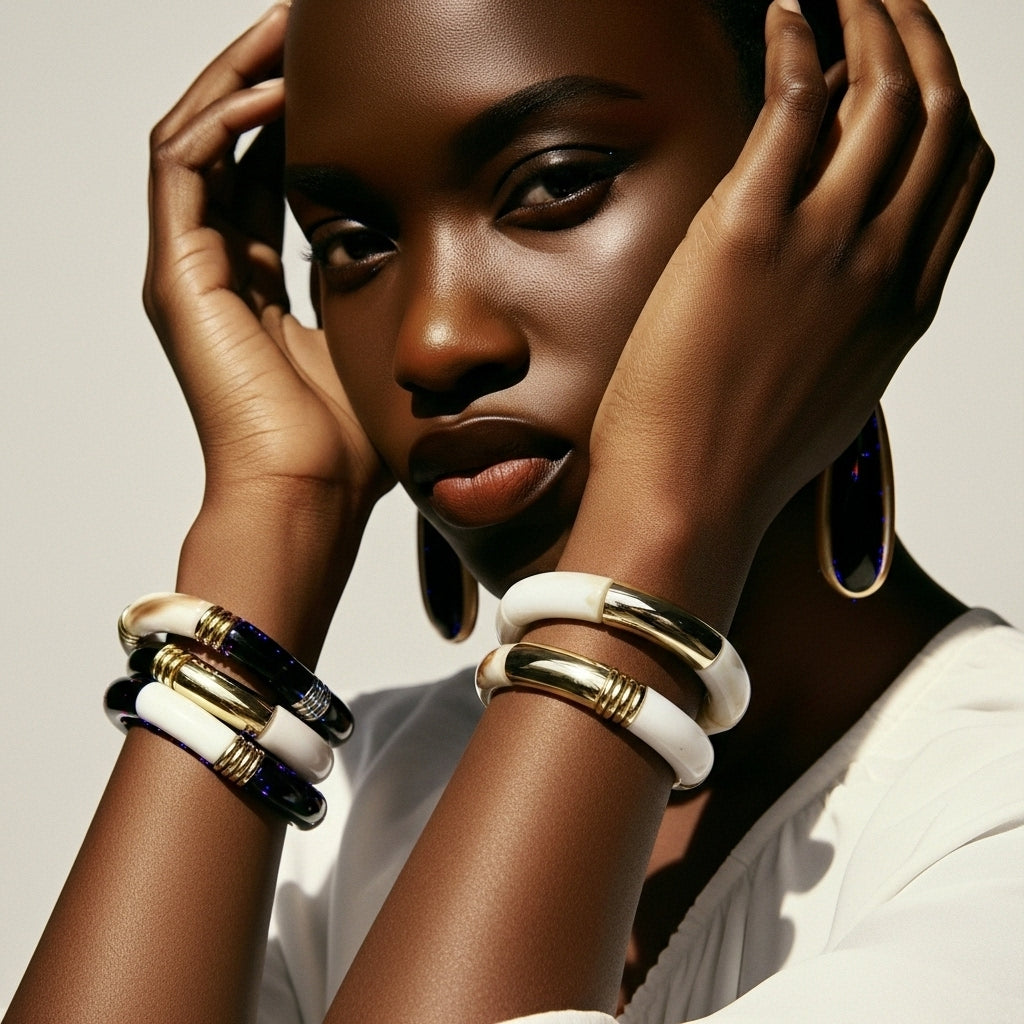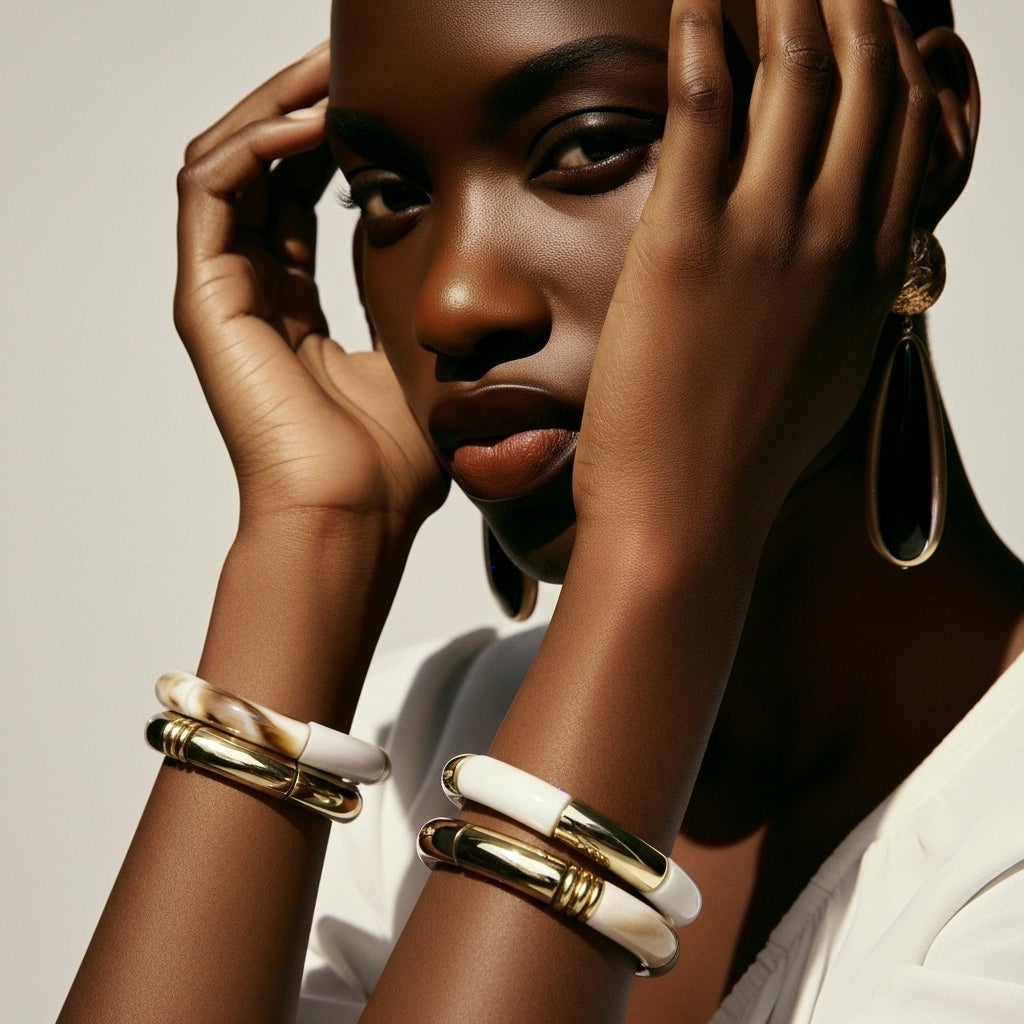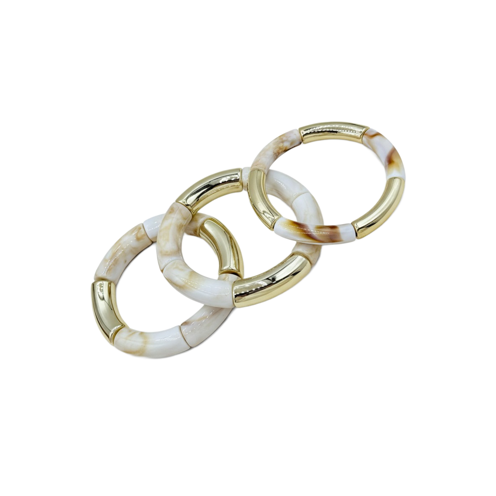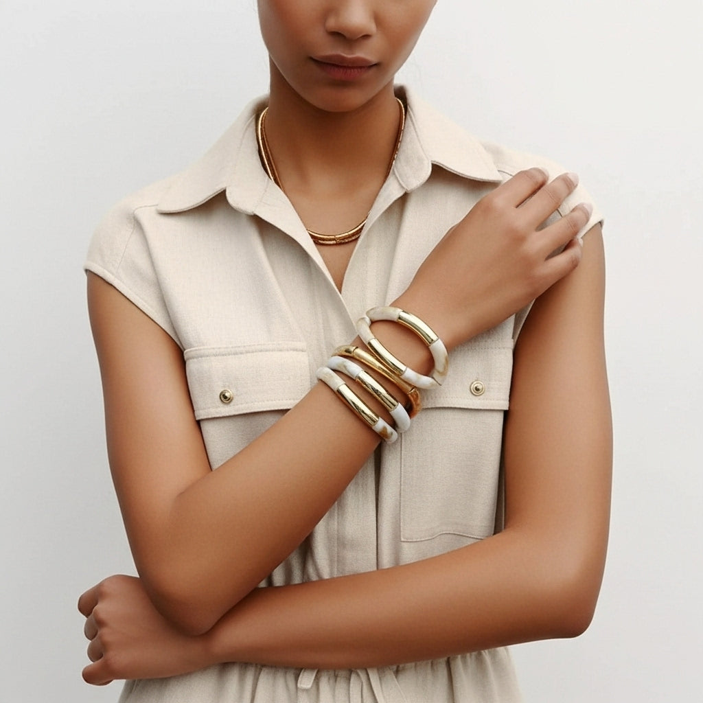 Ivory Bamboo Bileklik, fildişi-tonu mermerimsi segmentleri ve ipeksi altın görünümlü halkalarıyla bileğe temiz, sofistike bir hat verir. Bambudan ilham alan modüler formu hafif ve konforludur; tek başına zarif bir vurgu yapar, farklı bileziklerle yan yana takıldığında modern bir “stack” etkisi yaratır.