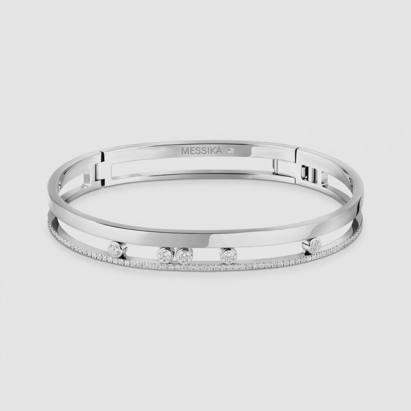 Kinetic Duet Kelepçe, mimari bir zarafetle iki ince hattı paralel taşıyan modern bir tasarım. Üst banttaki serbest hareketli pırlantalar ışıkla birlikte kayarak canlı bir ışıltı yaratırken, alt banttaki ince pavé şerit derinlik ve ritim katıyor. Parlak beyaz altın yüzey, bilekte ince ancak güçlü bir siluet sunar; tek başına minimal, diğer bileziklerle birlikte katmanlandığında iddialı bir duruş verir. Denge, akış ve hareket—Kinetic Duet her dönüşte bakışı üzerine çeker.