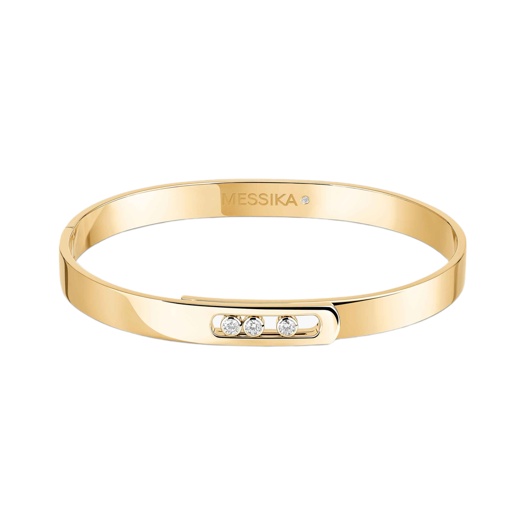 Lumen Trio Kelepçe, sarı altının parlak yüzeyinde yatay kapsül penceresi ve içindeki üç serbest hareketli pırlantayla ışığı adım adım peşine takan yalın-mimari bir tasarım. İnce-oval profil bileğe akıcı biçimde oturur; kapsülün cilalı hatları minimal görünümü korunurken güçlü bir odak yaratır. Tek başına sakin ve sofistike, katmanlandığında ise modern bir ışıltı ritmi: her harekette yeni bir parıltı, Lumen Trio.