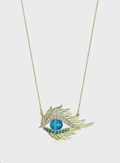 Lumia Eye Kolye, mistik sembolizm ile çağdaş tasarımın çarpıcı bir birleşimidir. Göz formunun merkezinde yer alan canlı mavi taş, içsel netliği ve sezgisel gücü simgelerken; çevresini saran alev benzeri kıvrımlar, koruyucu bir enerji ve dikkat çekici bir dinamizm yaratır. Üstteki ışık hatları ışıltıyı zarifçe yansıtırken, alt kısımdaki zümrüt tonlar tasarıma sofistike bir renk dengesi katıyor.