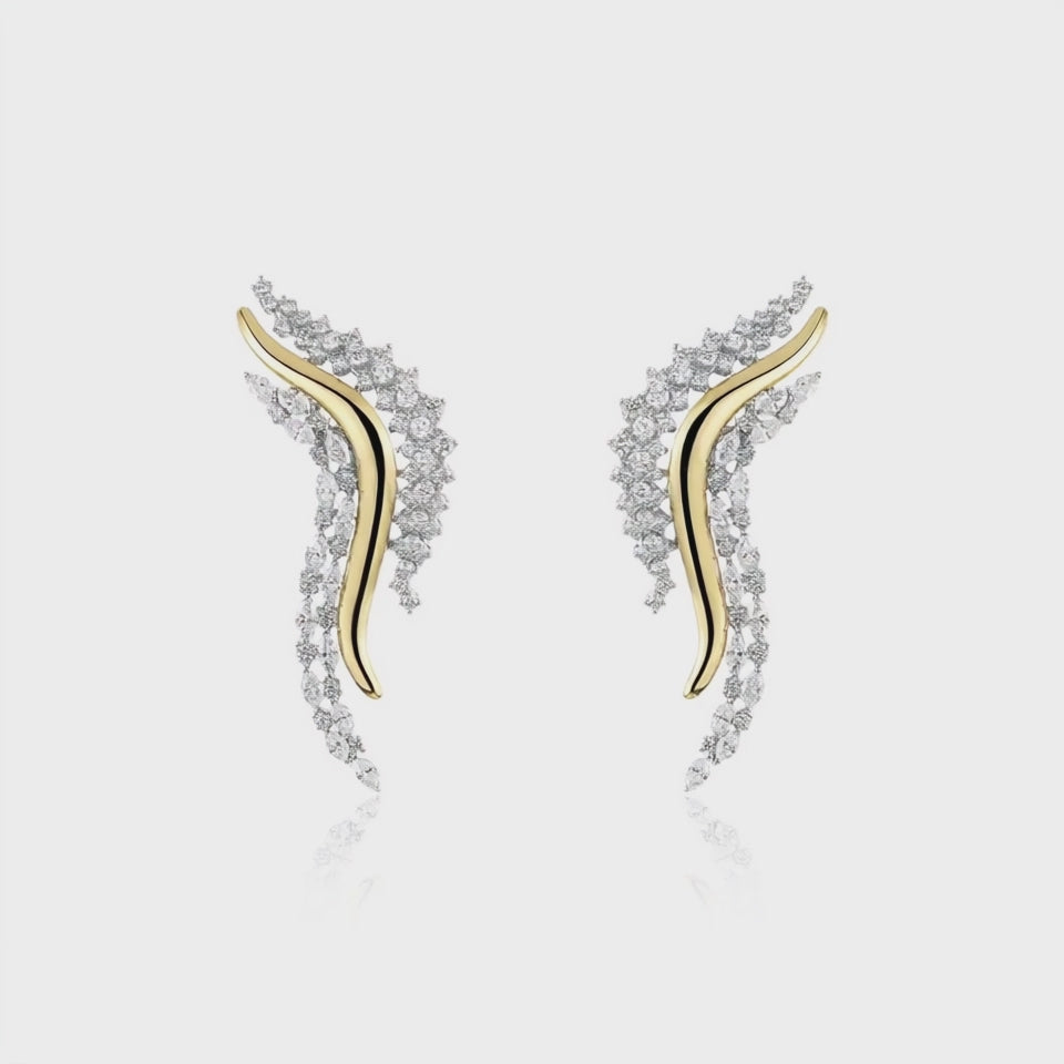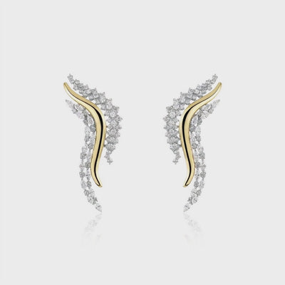 Kulak memesinden yukarı doğru tek çizgide yükselen altın bir ışık darbesi. İnce gövde, fırçayla atılmış keskin bir “swoop” gibi kıvrılır; kenarından taşan pırlanta bulutuysa fırça ucundan sıçrayan boya damlalarının ışıltılı versiyonu. Her minik taş, altının sıcak tonuyla kontrasta girerek yıldız tozu hissi yaratır—başınızı çevirdiğinizde bu toz, dalganın etrafında spiral bir iz bırakır.