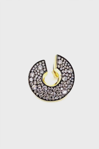 Lux Eclipse Küpe, tam tur pavé taşlarla kaplı yarım ay formunu, parlak altın iç kavisle keskin bir zıtlığa taşıyarak adını aldığı tutulma anını yakalar. Siyah rodyum vurgulu dış yüzey gökyüzünün karanlığını, iç halka ise ışığın geri dönüşünü temsil eder; iki katman birbirine değmeden yan yana durur ve kulak hizasında dinamik bir derinlik oluşturur. Minimal kesik, tasarımı klasik huggie’den ayırıp mimari bir siluet kazandırırken kulak memesine ağırlık bindirmeyen dengeli bir oturuş sağlar. Gün ışığında denim ceketle beklenmedik bir keskinlik, gece ipek elbiseyle sahnenin bütün odağını üstüne çeken modern bir imza; Lux Eclipse, gündelik cesareti lüksle harmanlayıp tek bakışta akılda kalır.