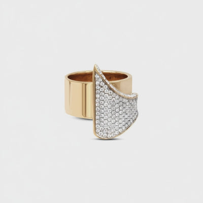 Lysore Yüzük, ışığın geometrik bir forma bürünerek parmakta hayat bulduğu, modern sanat ile yüksek zanaatkârlığın birleşimidir. Geniş ve pürüzsüz altın band, kendinden emin bir duruş sergilerken; yüzeye yukarı doğru yükselen asimetrik form, yüzüğe heykelsi bir hareket kazandırır. Üst kısmı tamamen taşlarla kaplı bu bölüm, ışığı her açıdan yakalayarak göz alıcı bir yansıma sunar.