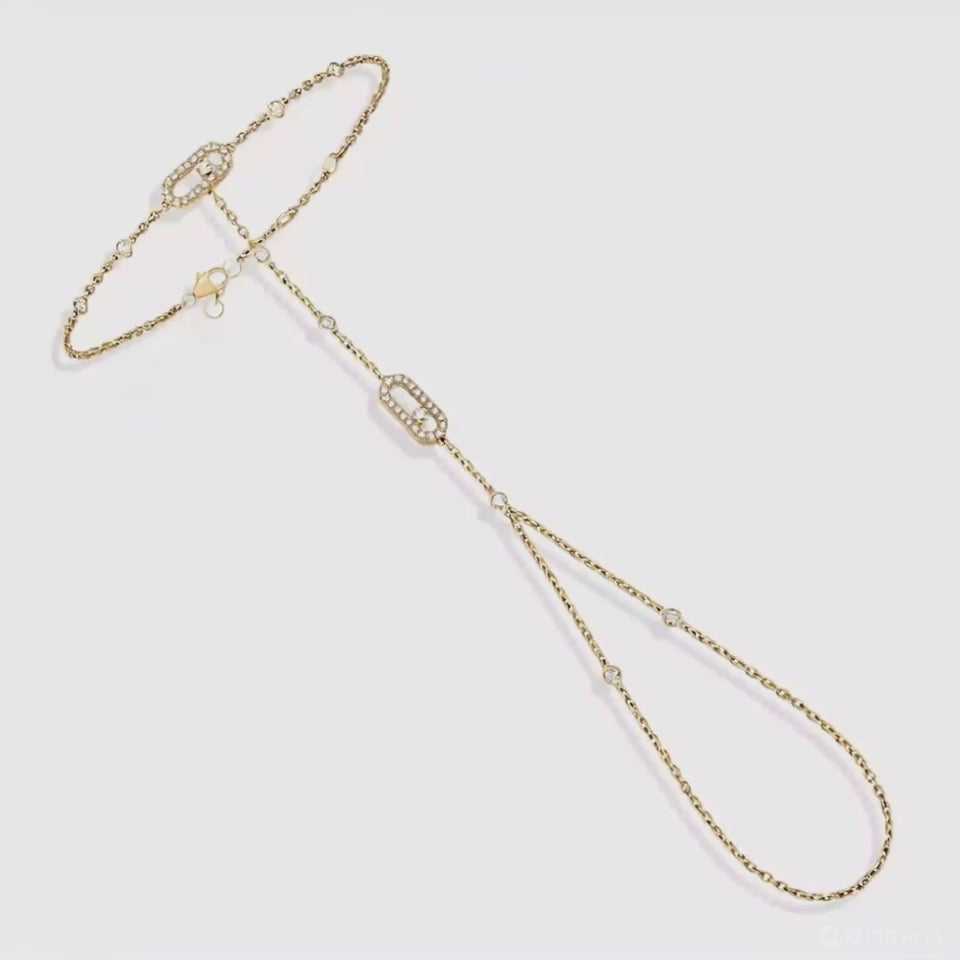 Bilekte iki kez dönen ince altın çizgi, orkestranın hazırlık tınısı gibi hafifçe gerilir; merkezdeki dikdörtgen kafes, içindeki kayar pırlantayla ilk notayı verir. Zincir boyunca dağınık yerleştirilmiş küçük yuvarlak taşlar bu harekete yankı olur, ışığı bir durak öteye iletir. Bileğe uygun ayarlama sağlanması için uzatma zinciri bulunmaktadır. Dikey hat, göze çarpmayan üç bağlantı ile çatallanıp parmak halkasına kadar iner ve her adımda ipeksi bir ritimle sallanır.