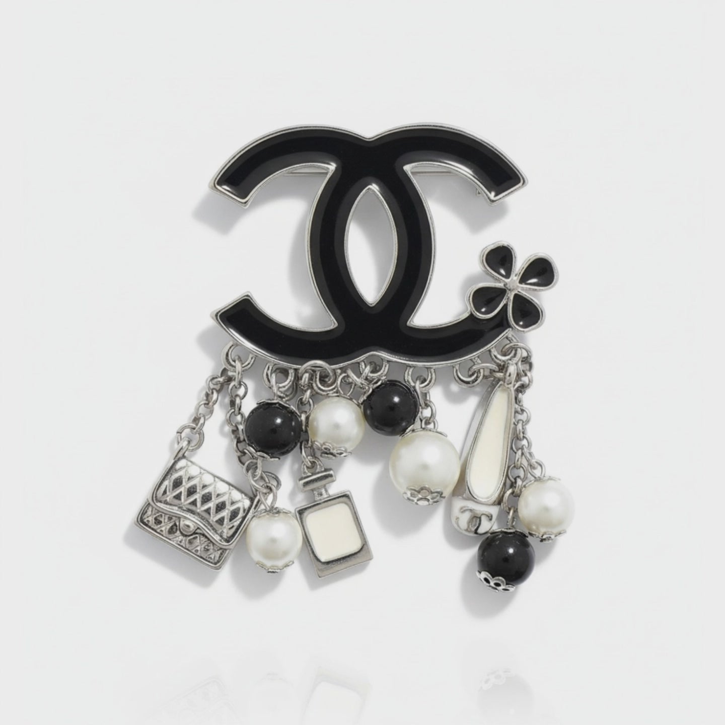 Miniatures & Pearls Broş, siyah mine monogramın altında salınan minyatür ikonlarla (kapitone çanta, parfüm şişesi, zarif topuk) ve parlak incilerle parizyen bir hikâyeyi tek parçada taşır. Zincir saçaklar yürüdükçe ritim üretir; siyah-beyaz kontrastı ve parlak metal dokular ışığı net toplar, fotoğraflarda pürüzsüz ve “statement” görünür. Beyaz gömlek yakasında grafik ve sofistike, blazer klapesinde karakterli, denim ve tişörtle beklenmedik derecede oyunbaz durur; bir elbiseyi de tek hamlede “geceye hazır” seviyesine taşır. Parça çok aksesuar istemez; ince halka küpeler veya sade bir zincir yeter, tek başına kullanıldığında bile görünümü tamamlar. Denge merkezi kumaşı çekiştirmez, gün boyu yerinde kalır; yakından bakıldığında minyatürlerin kabartı detayları ve incilerin saten ışıltısı işçiliği hissettirir. Hediye edildiğinde yalnız şık bir aksesuar değil, moda evinin ikonlarına saygı duran küçük bir arşiv anısı verirsiniz.