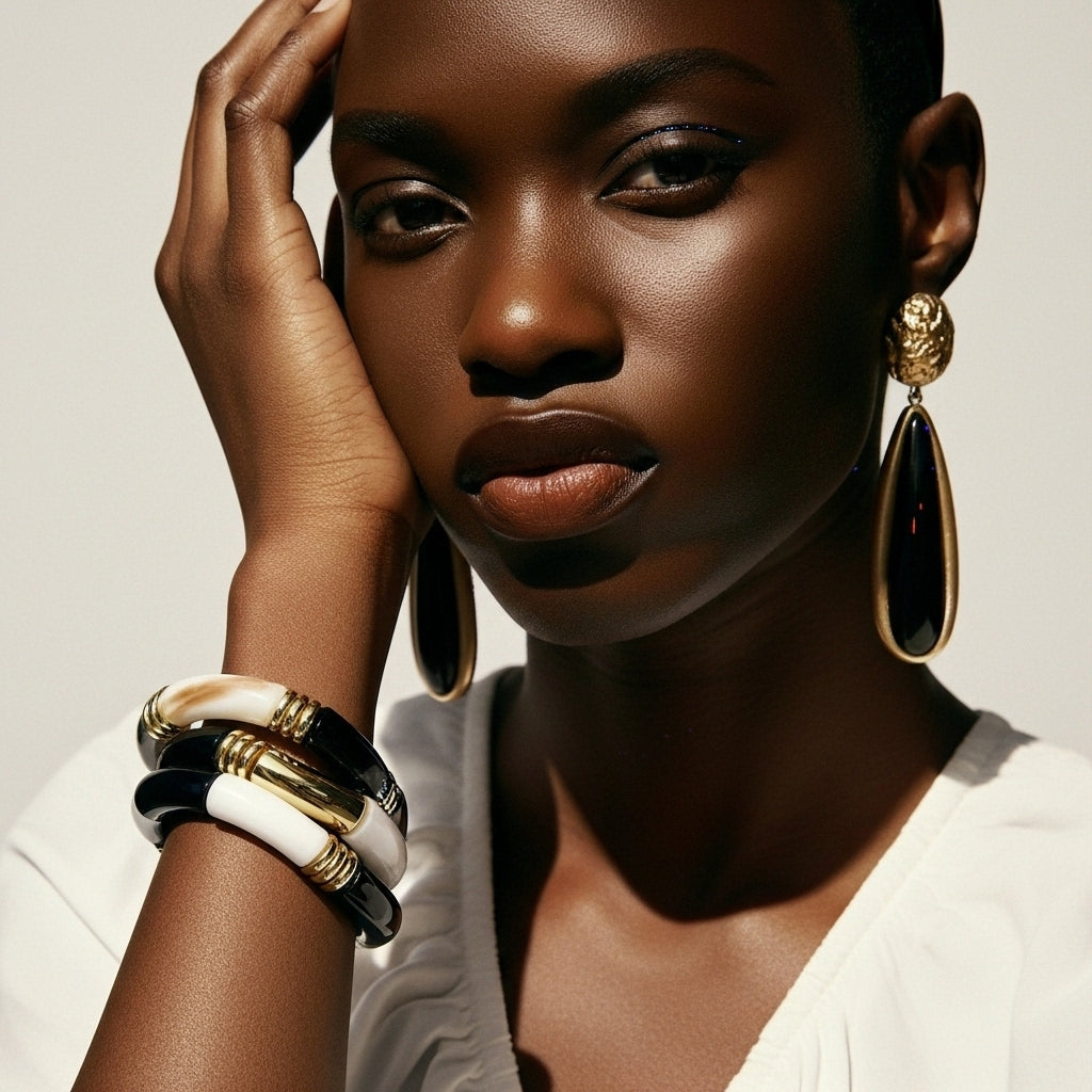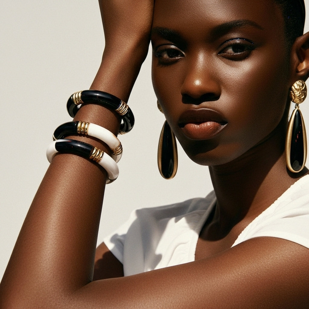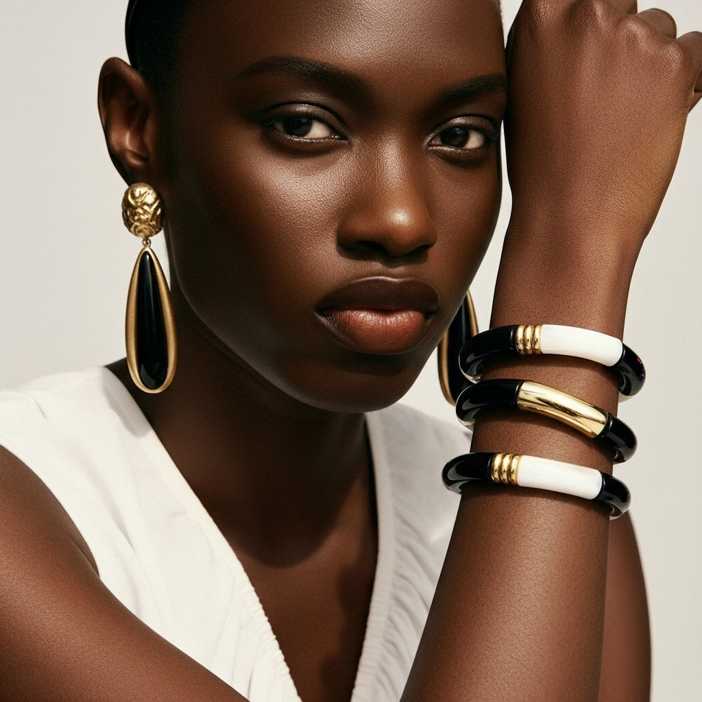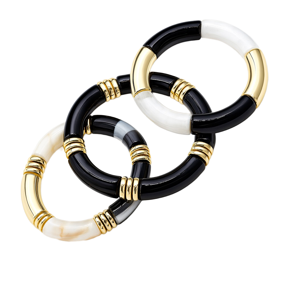 Monochrome Bamboo Bileklik, siyah ve fildişi tonların keskin kontrastını bambudan ilham alan segmentli formda buluşturarak bileğe grafik ve modern bir siluet verir. Parlak yüzeyli halkalar ile altın tonlu detayların ritmi, tek başına minimal bir vurguya; birden fazla bileklikle birlikte takıldığında iddialı bir “stack” etkisine dönüşür. Nötr ama karakterli paleti hem ofis şıklığına hem gece görünümlerine zahmetsizce uyum sağlar.
