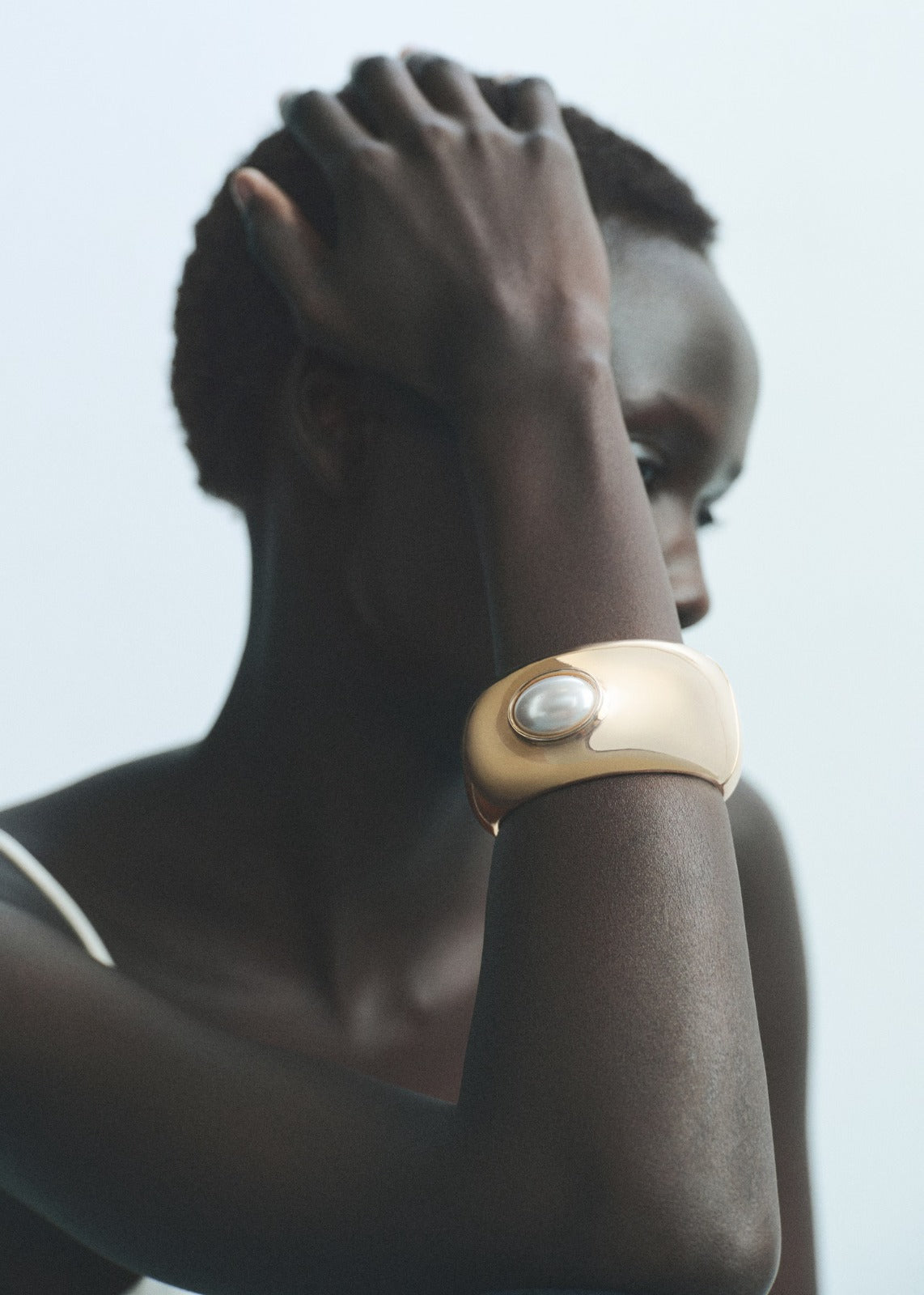 Monolith Pearl Kelepçe, tek parça heykelsi formu ve merkezde yükselen oval incisiyle güçlü bir siluet sunar. Ayna parlaklığındaki geniş yüzey ışığı pürüzsüzce toplar, bilekte modern bir mimari hat yaratır. Yumuşak iç kavis rahat bir oturuş sağlar; tek başına kullanıldığında kıyafetin odak noktası olur, sade elbiseler ve keskin çizgili takımlarla net bir kontrast kurar. Zaman dışı tasarımıyla gündüzden geceye sorunsuz geçer.