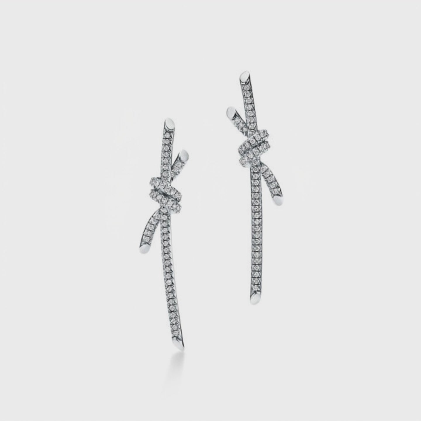 Nivelle, “bağ”ın zarafetini modern bir çizgiyle yorumlar. İnce, uzatılmış hatlar boyunca sıralanan ışıltılı pavé taşlar; merkezdeki heykelsi düğüm motifiyle buluşur ve her hareketinizde ışığı yakalayan, akışkan bir parıltı yaratır. Kulağı zarifçe takip eden siluet yüz hatlarını optik olarak uzatır; minimal ama etkisi yüksek bir görünüm verir.