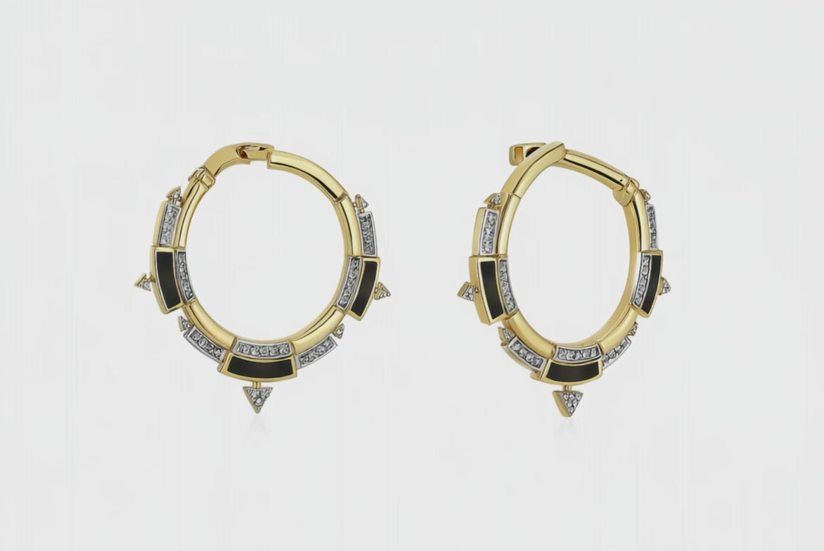 Gecenin gizemiyle ışığın zarafetini buluşturan Noctelle Hoops, siyah taşlarla bezenmiş altın halka formuyla güçlü bir silüet sunar.
