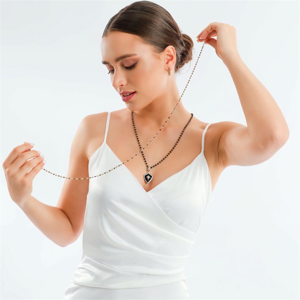 Siyah boncuklu ince zincire eklenmiş sivri uçlu yıldız formu… North Star Kolye, sade bir formda yön gösteren yıldız fikrini taşıyor. Günlükte minimal durur, gece giyildiğinde siyahın üstünde parlak bir odak yaratır. Katmanlı kolye kullanımına da uygun, tek başına takıldığında da yeterince karakterli.