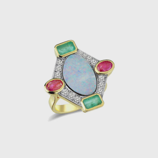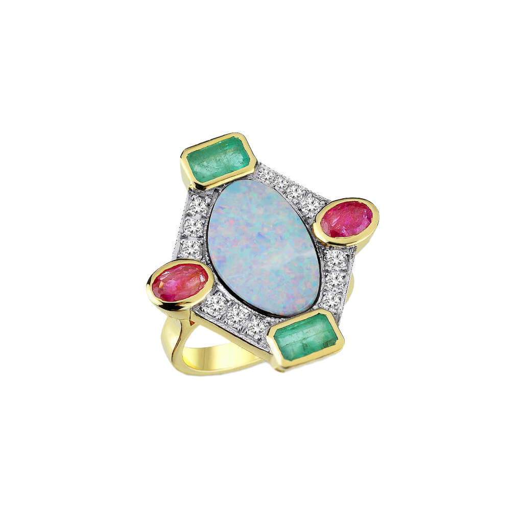 Opaline Tableau Yüzük, ışığı tablo gibi toplayan kompozisyonuyla dikkat çeker: merkezde sütlü alev oyunlarına sahip oval opal, etrafında el işçiliği pavé pırlanta çerçeve ve iki uçta zıt uyumlu zümrüt ile yakut yerleşimi. Art-Deco ilhamlı geometrik silüet, sarı altının sıcak tonu ile güçlendirilir; opalin mavi-pembe ışıltısı hareket ettikçe canlı biçimde değişir. Baget zümrütler ve oval yakutlar, opali optik olarak büyütürken yüzüğe modern-klasik bir denge kazandırır. İnce yükseltilmiş tabla günlük kullanımda maksimum ışık alımı sağlar, elde hafif ve konforlu bir his bırakır. Her doğal taşın iç dokusu benzersizdir; bu yüzden her Opaline Tableau, yalnızca size ait tekil bir ifadeye dönüşür.