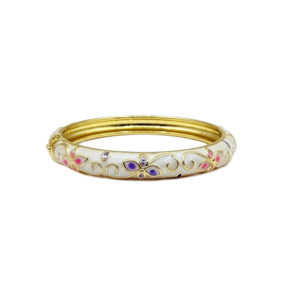 Palais Cloisonné Kelepçe, opalin mine yüzey üzerine altın tonlu kluazon (cloisonné) hatlarla işlenen zarif floral motifleri modern, heykelsi bir ovallikte toplar. Parlak kenarlar ile satenimsi mine arasındaki kontrast, bilekte tek bakışta seçilen rafine bir ışıltı üretir. İnce ayarlı gövde çizgiyi kesmeyen gizli menteşe–klik kilitle tamamlanır; iç yüzey pürüzsüzdür ve akıcı bir tak–çıkar deneyimi sunar. Mimari oranları, couture mücevher kodlarını güncel bir formda yeniden yazar; tek parça hâlinde güçlü durur ve koleksiyonda “imza” statüsüne yerleşir.
