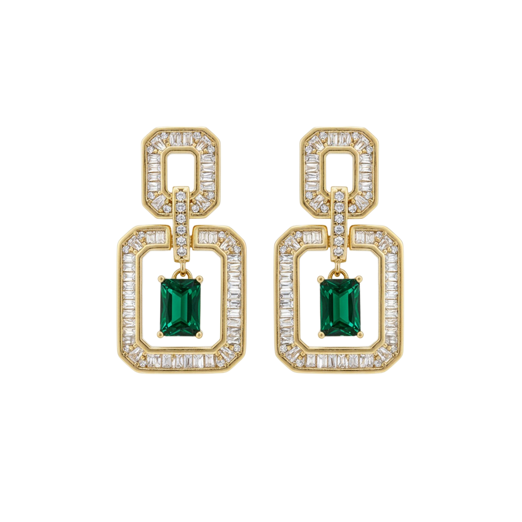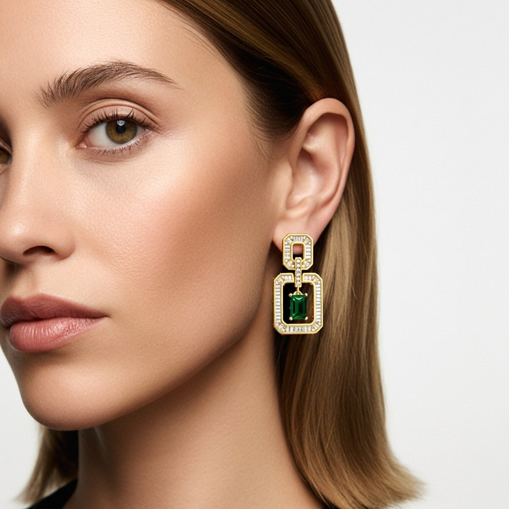 Palais Küpe, saray mimarisinden ilham alan art-deco çerçeve formu ve merkezdeki zümrüt tonlu dikdörtgen taşla bakışı kilitleyen, heykelsi bir siluet sunar. İnce işçilikli köşeli halka yapısı ışığı çok yönlü kırarak güçlü bir ışıltı verir; hareketle birlikte orta taş zarifçe salınır ve yüz hatlarını aydınlatır. Altın tonlu gövde ile baguette etkili taşların kontrastı, siyah ve krem tonlu gece elbiselerinde dramatik; keskin yakalı gömlek ve blazer kombinlerinde modern ve sofistike bir duruş yaratır.