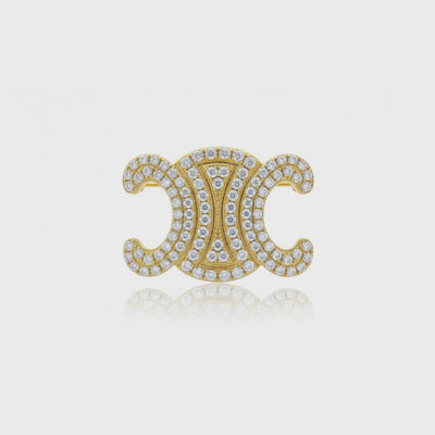 Pavé Atrium Broş, mimariden ilham alan simetrik kıvrımlarıyla ışığı bir avluda toplanır gibi merkezde buluşturur. İkiz hilalin iç hattına yerleşen kademeli pavé, her mikro harekette çizgi çizgi parlayarak formu belirginleştirir; altın tonun sıcaklığıyla birleşen bu berraklık, yakada ve ceket klapesinde ilk bakışta “tamamlanmış” bir siluet yaratır. Fotoğraflarda pürüzsüz okunan parlaklık günlük hayatta da aynı netlikte kalır; beyaz gömlekle sakin ve rafine, siyah-lacivert tonlarla iddialı, ipek elbise omzunda ise sahneyi ele geçiren bir odak etkisi verir. Tasarımın merkezindeki daralan açıklık parçaya nefes aldırır; yoğun ışıltıyı dengeler, broşa hafiflik ve modernlik kazandırır.