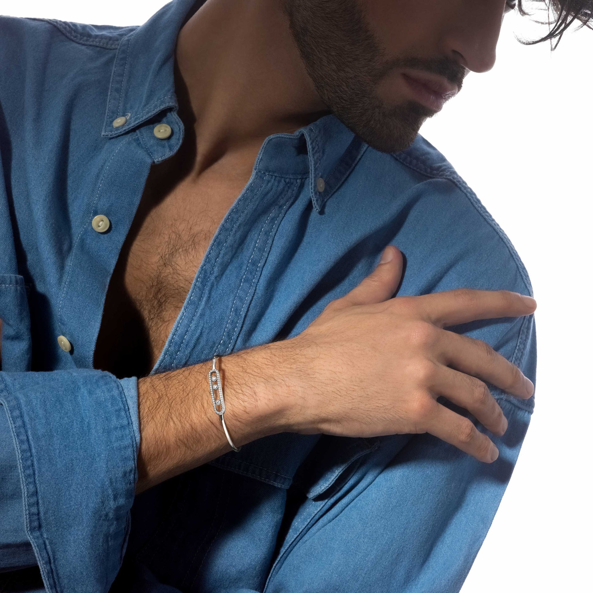 Pavé Capsule Kelepçe, bileği zarifçe çerçeveleyen ince bir halka üzerinde uzatılmış kapsül formuyla modern bir ışıltı sunar. Kapsülün pavé taşlı çerçevesi kesintisiz bir parıltı yaratırken, iç ray üzerindeki üç serbest hareketli pırlanta her adımda kayarak canlı bir ışık oyunu üretir. Parlak beyaz altın görünümündeki yüzey, minimal siluetiyle günlük şıklığa uyum sağlarken tek başına sofistike, katmanlandığında ise etkileyici bir vurgu oluşturur. Hafif, konforlu, zamansız: Pavé Capsule her bakışta ince bir lüks hissi bırakır.