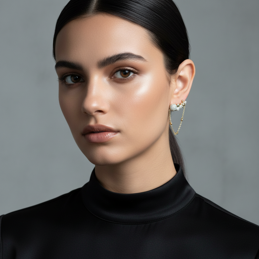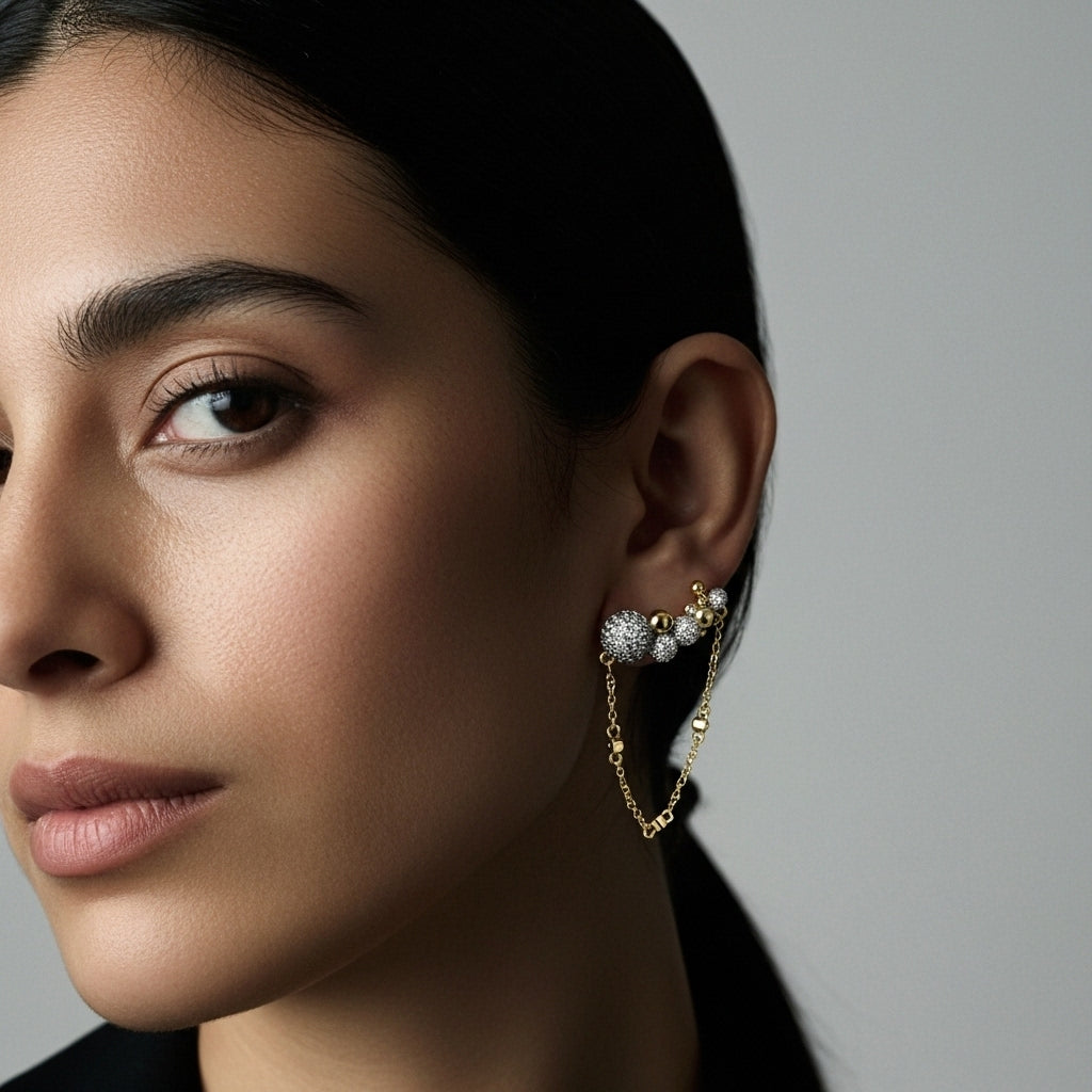 Minik altın ve taşlı kürelerin yan yana gelmesiyle oluşan bu model, kulağa doğal, organik ve modern bir siluet verir. Küçük ama dikkat çekici; tek başına takıldığında zarif, diğer küpelerle katmanlandığında stil sahibi durur. Günlük şıklığa lüks bir dokunuş eklemek için tasarlandı.