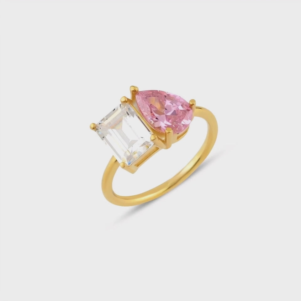 Pink Aurora Yüzük, şafak hattında birdenbire patlayan pembe ışık selini parmağa mühürler. Baguette kesim taşlar, altın kavis boyunca kuzey ışıkları gibi ardışık bir ritimle dizilir; merkezdeki damla form, geceyle gündüzün kesişiminde donmuş bir pembe kıvılcım gibi yükselir. Işık, ince kanalın içinde kesintisiz dolaşırken her mikro-harekette safir tonundan gül altın alevine genişleyen bir renk tayfı üretir. İnce profil, zarafeti hafifliğe borçludur fakat yüzüğün panoramik parlaklığı bakışları kilitlemekte acımasızdır.
