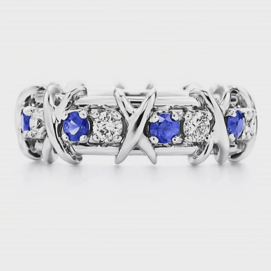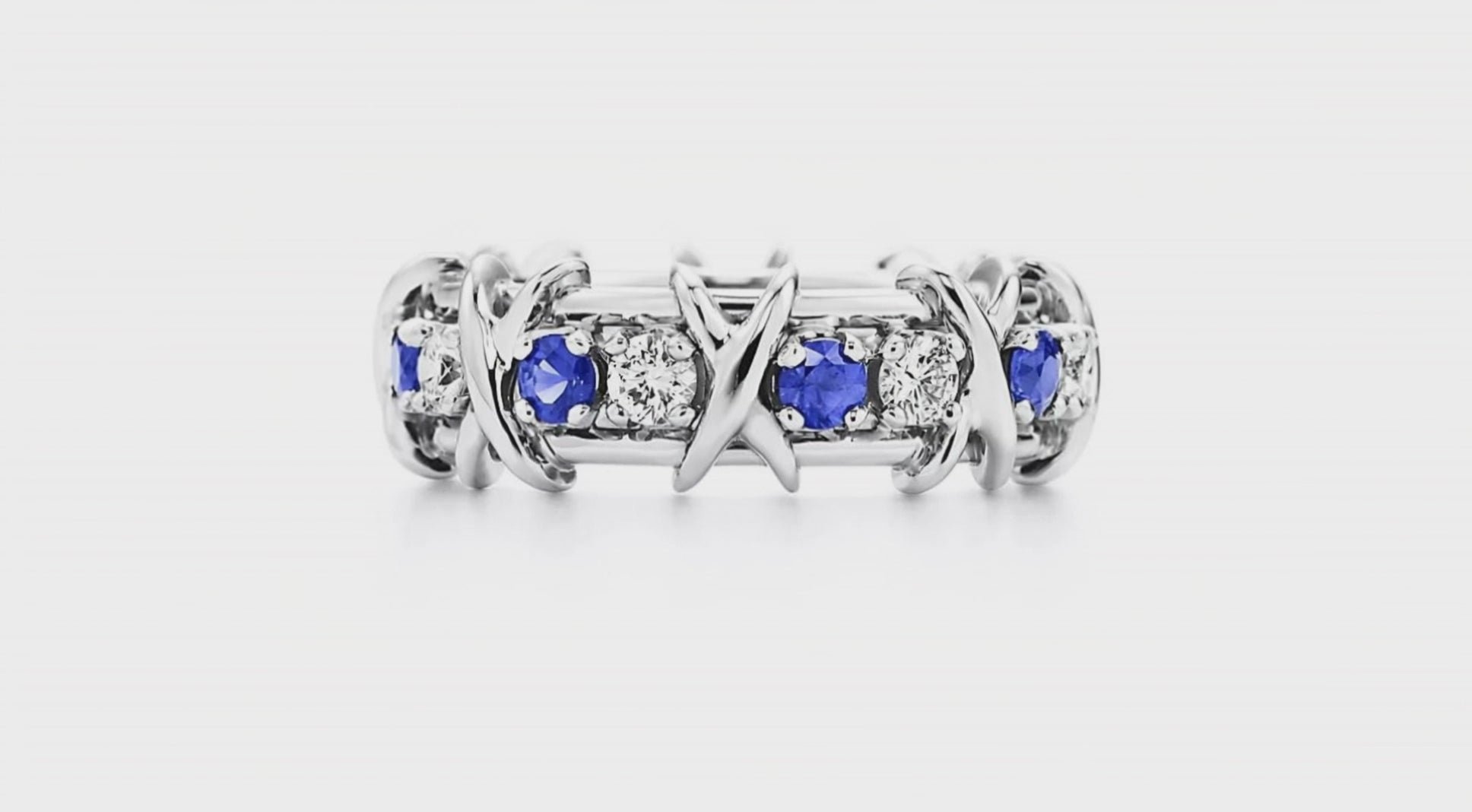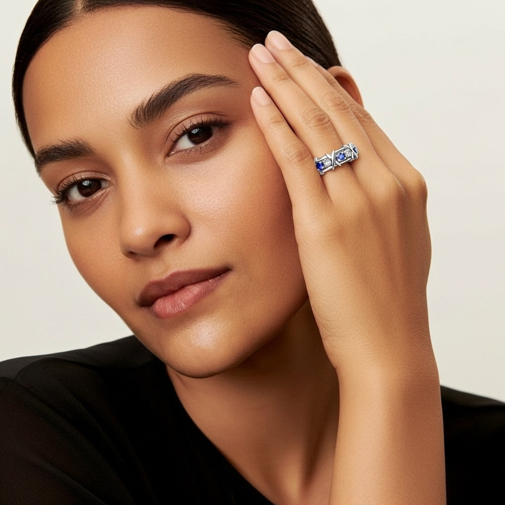 Polaris Sapphire Yüzük, safir mavisi ve buz beyazı taşları ritmik aralıklarla buluşturan X-claw mimarisiyle keskin bir ışık hattı kurar. Çapraz kollar, her taşı modern bir kafes gibi sarar; ışık kavşaklarda yükselir, üstten bakışta çizgi hâlinde parlar. Soğuk parlak platinimsi gövde, derin mavi tonun doygunluğunu öne çıkarır; yan profilde tekrarlayan “X” modülleri yüzüğe grafik ve heykelsi bir karakter verir. Profil bilinçli biçimde kompakt tutulmuştur—güçlü etkiyi yalın bir formda sunar, elde net bir otorite hissi bırakır.