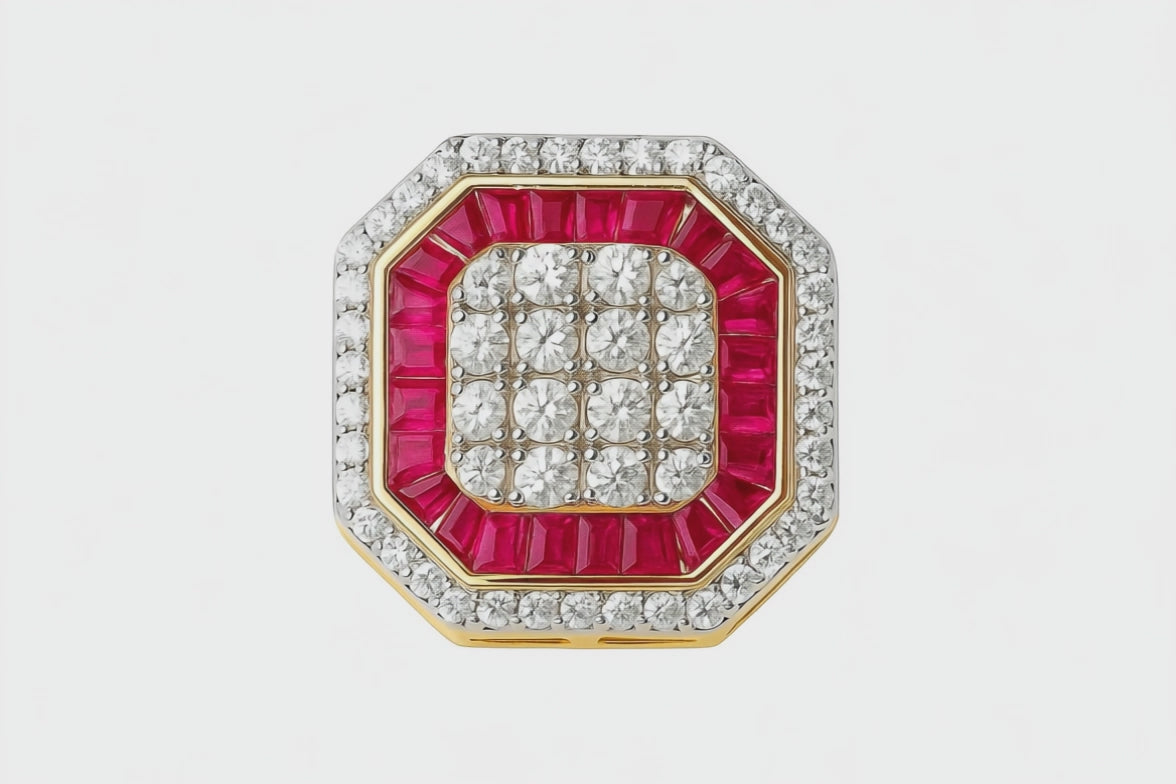 Yakut kırmızısının büyüleyici derinliği, pırlantanın zamansız ışıltısıyla buluşuyor. Katman katman örülmüş sekizgen formlu bu tasarım, hem tarihî bir zenginliği hem de çağdaş bir ihtişamı simgeliyor. Ortadaki simetrik pırlanta dizilimi; her bakışta başka bir ışık yansıtırken, etrafını çevreleyen yakutlar bu ışığı tutkulu bir sıcaklığa dönüştürüyor.