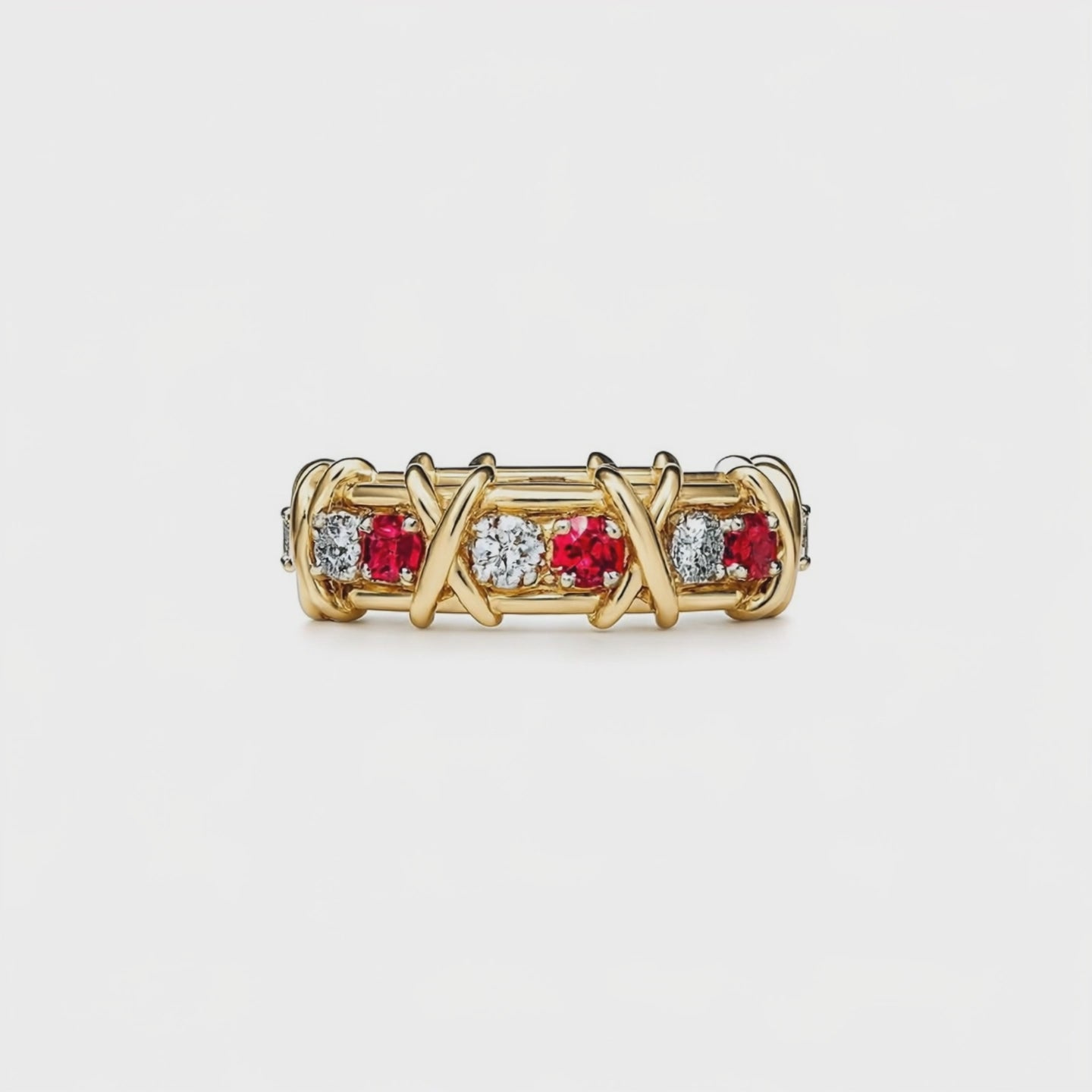 Rouge & Ice Yüzük, kraliyet tonundaki yakut kırmızısı ve keskin buz beyazını altın bir hat üzerinde ardışık ritimde buluşturur. Taşları sıkı bir ızgara gibi saran X-claw (çapraz pençe) mimarisi, yüzüğe zırh hissi verir; her açıdan ışığı yakalayan yapı, parıltıyı tek çizgide yoğunlaştırır. Profil, elde güçlü ama sofistike bir iz bırakacak şekilde kompakt tutulmuştur; üstten bakışta taşlar kesintisiz bir “kırmızı–beyaz” şeride dönüşür.