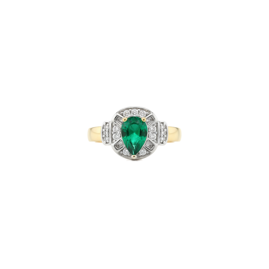 Kraliyet mücevherlerinden ilham alan bu model, armut kesim merkez taşını çok katmanlı pavé çerçeveyle yükselterek dramatik bir parlaklık yaratır. Altın halka sıcaklık verirken beyaz tonlu üst yapı taşın rengini öne çıkarır. Özel gün yüzüğü gibi durur ama statü göstergesi olarak günlük şıklığa da takılabilir.