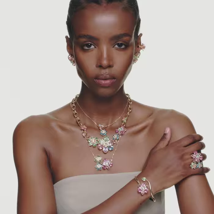 “Rubiél Twist”, canlı kırmızı yaprak taşları, parlak turkuaz detayları ve ortadaki zümrüt yeşili merkez taşıyla hayat dolu bir çiçek formunu temsil ediyor. Kavisli altın sap detayı, tasarıma modern ve kıvrak bir dinamizm katıyor.