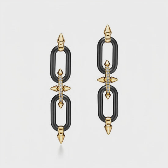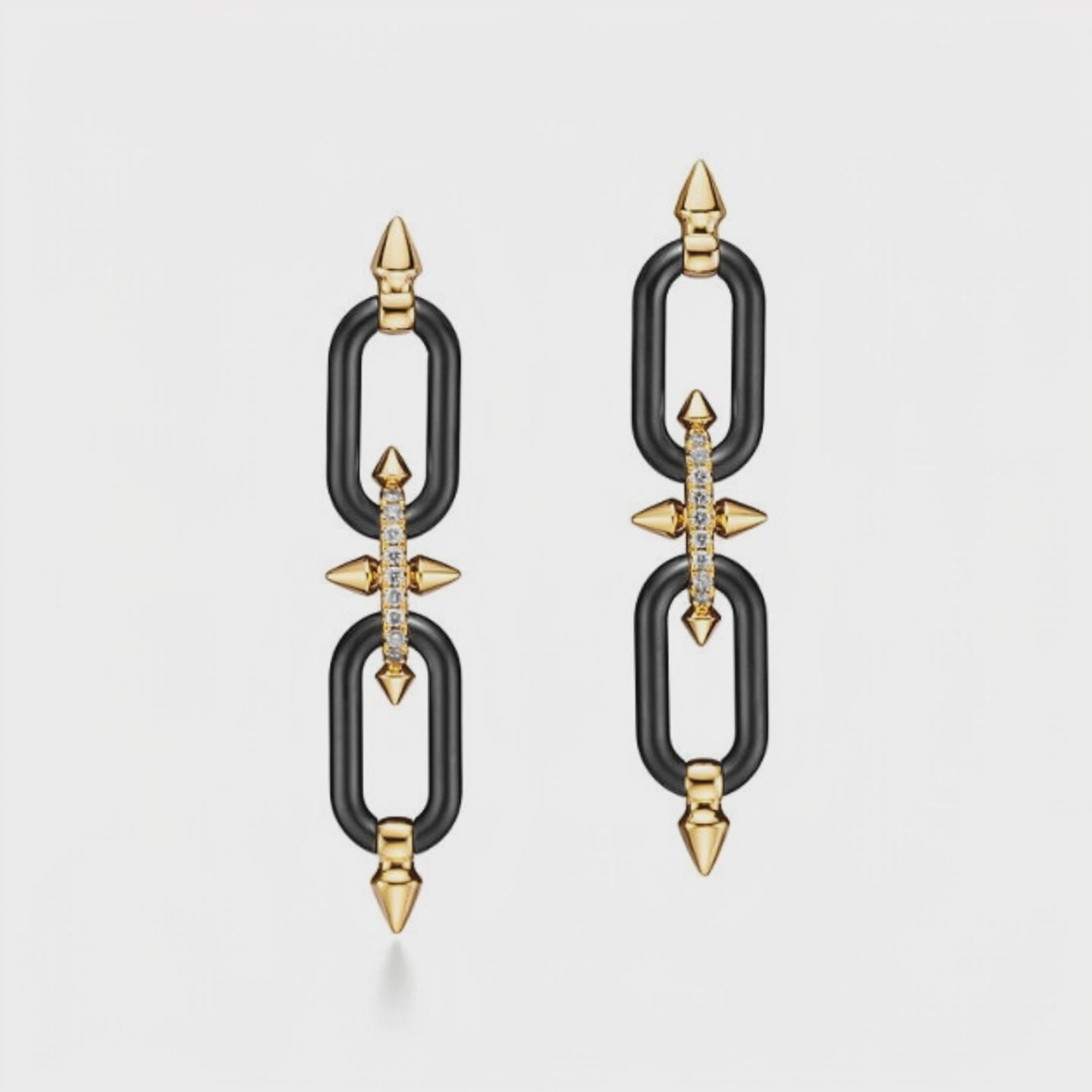Siyah ve altının keskin kontrastından ilham alan Shadow Link Küpe, zincir formu ve sivri uç detaylarıyla güçlü bir karakter sergiler. Orta bölümdeki taş sırası, koyu tonların gizemini parlak bir ışıltıyla dengeler. Modern, iddialı ve özgün duruşuyla hem gündüz hem de gece stillerine çarpıcı bir dokunuş katar.