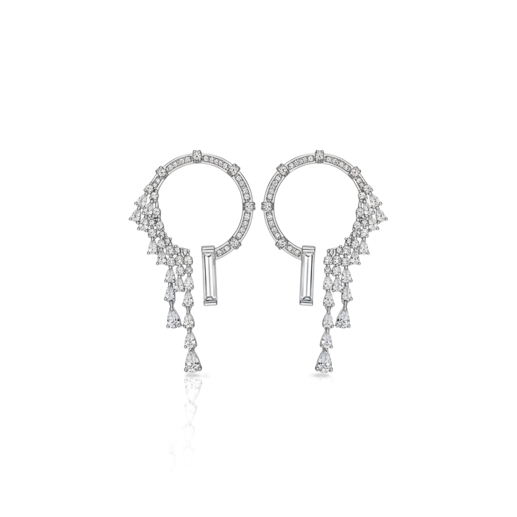 Starlit Drapery Küpe, pavé taşlı halka üzerine yerleştirilen baget merkez ve asimetrik şelale kesim damlalarla teatral bir ışık hareketi yaratır. İnce eklemli zincir yapısı her adımda akış sağlar, halka form kulakta dengeli durur. Gece elbiselerinde heykelsi bir odak sunar; Ruby, Sapphire ve Diamond varyantlarıyla tekli ya da çiftli kullanımda sahne etkisini güçlendirir.