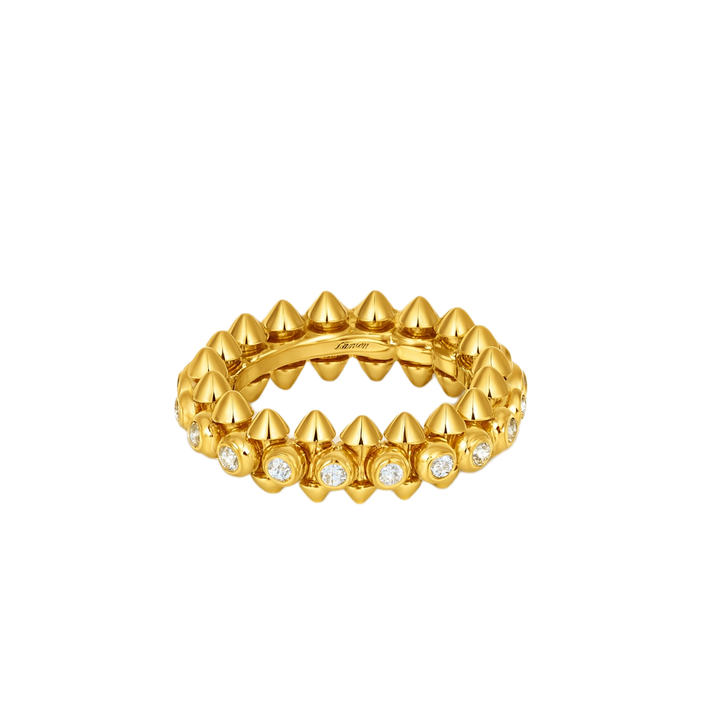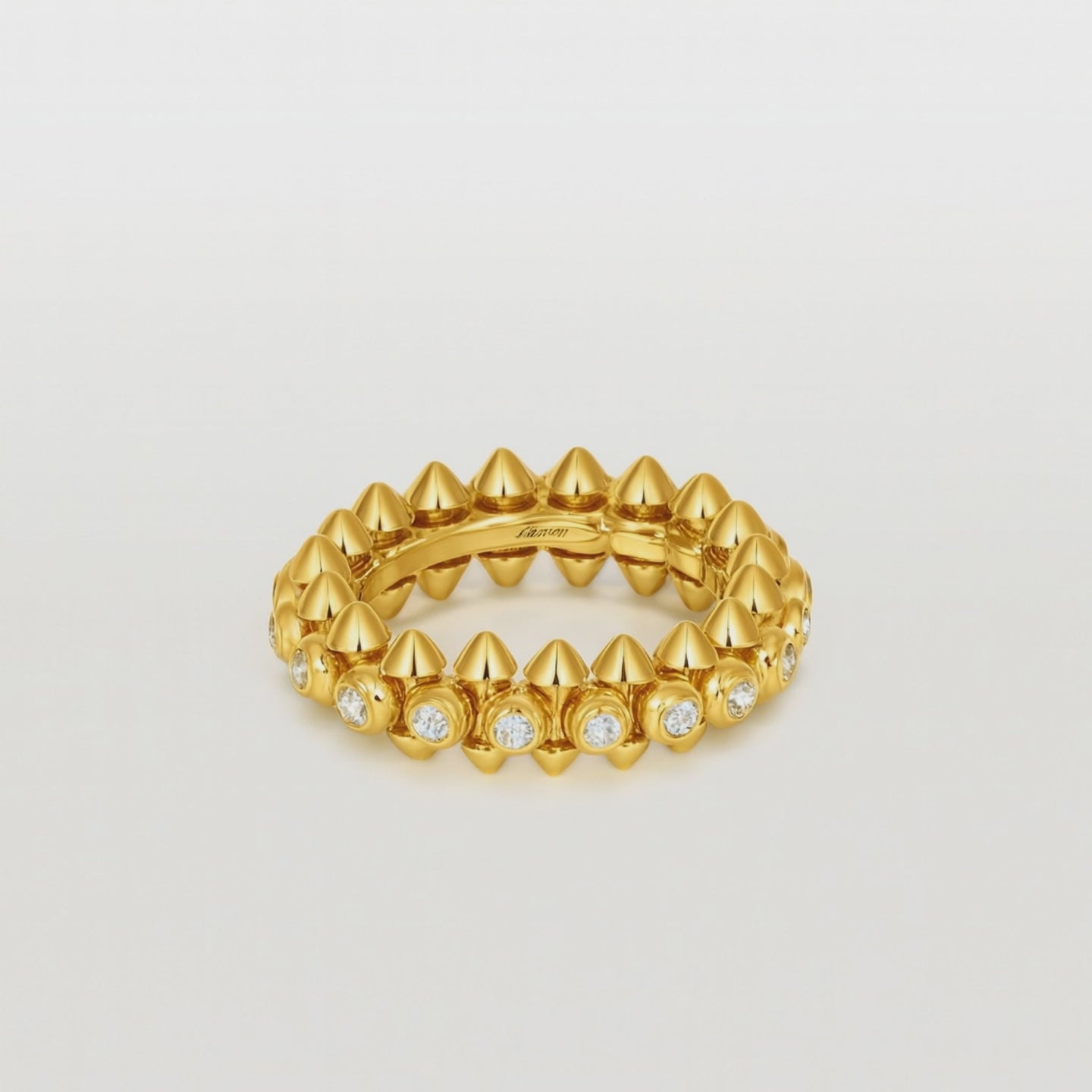 Thalisse V Yüzük, tüm çevreyi saran konik kabaralar ve aralarına yerleştirilen yuvarlak parlak taşlarla dinamik bir ışıma yaratır. Hafif V profilli gövde parmak çizgisini inceltir, ayna cilalı yüzey keskin yansımalar verir. Tek başına güçlü bir odak sunar; ince bantlarla katmanlandığında modern ve karakterli bir stack etkisi oluşturur. Zamansız, net ve cesur.
