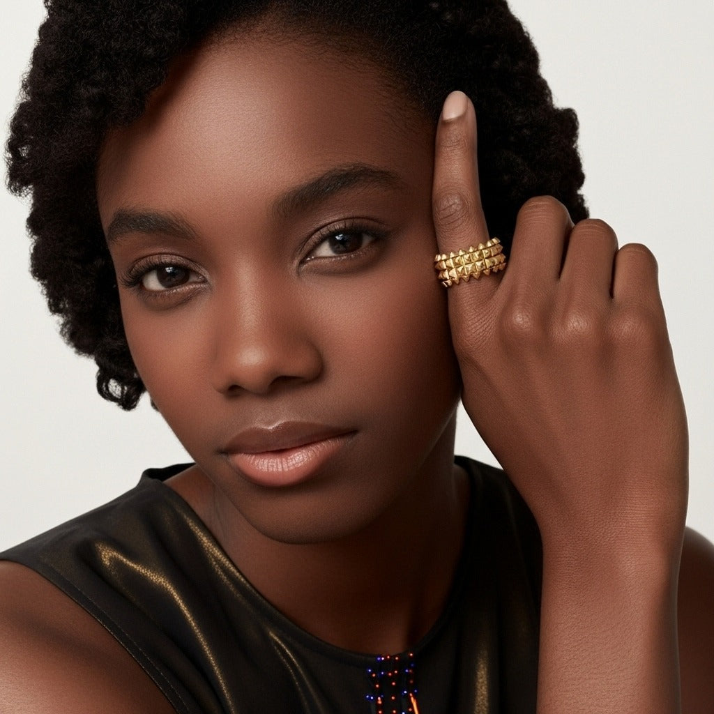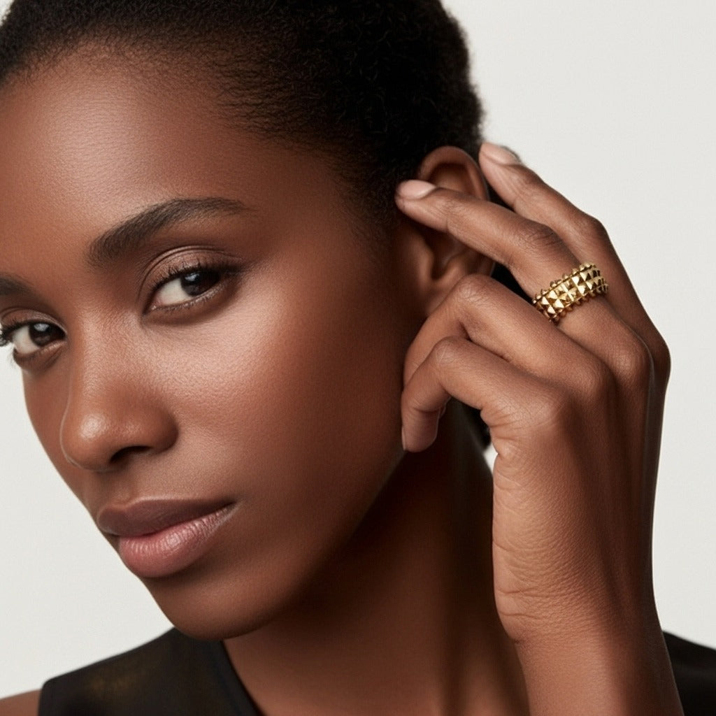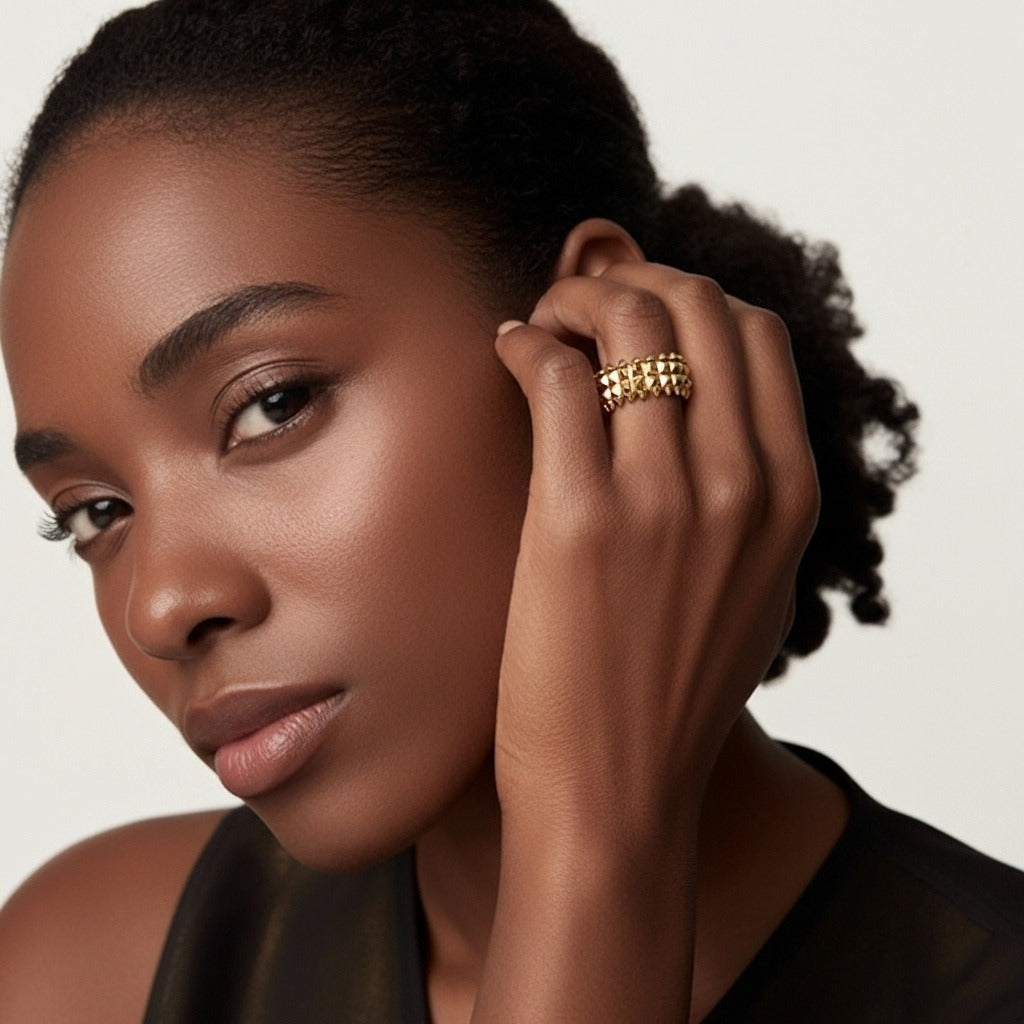 Thalisse Yüzük, 360° devam eden piramit dokusu ve kubbe uçlarıyla mimari bir siluet verir. Parlatılmış yüzeyler ışığı keskin yansıtır, her harekette güçlü bir ritim oluşturur. Dengeli yüksekliği ve iç kavisli bandı parmakta konforlu oturur. Tek başına karakterli bir odak, ince bantlarla eşlendiğinde modern bir stack etkisidir. Zamansız, güçlü ve net.