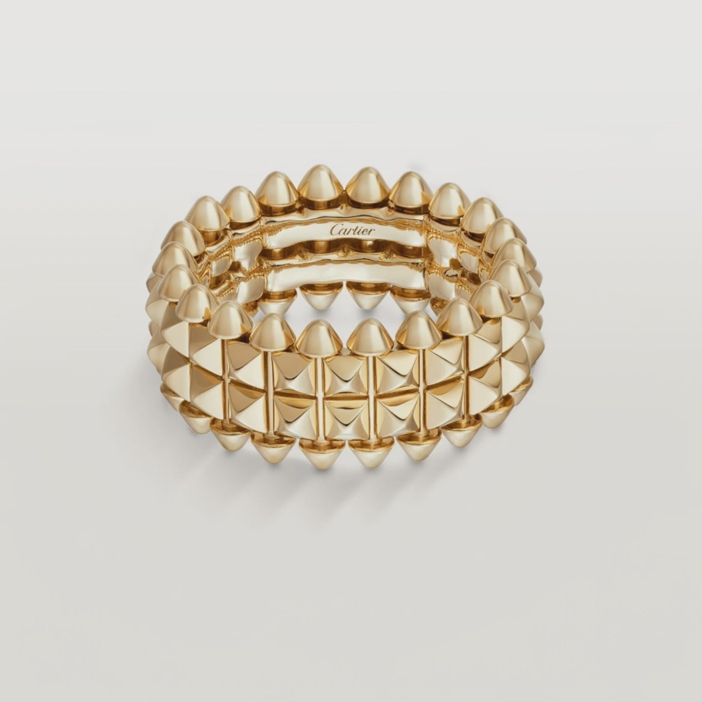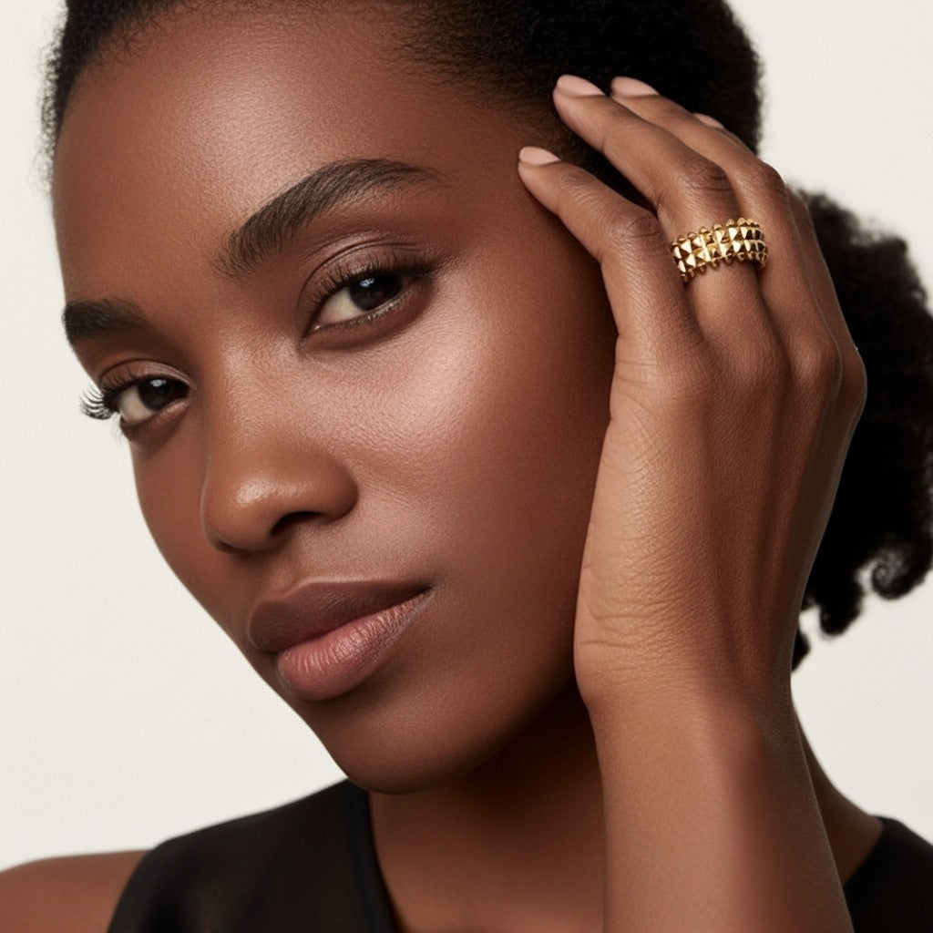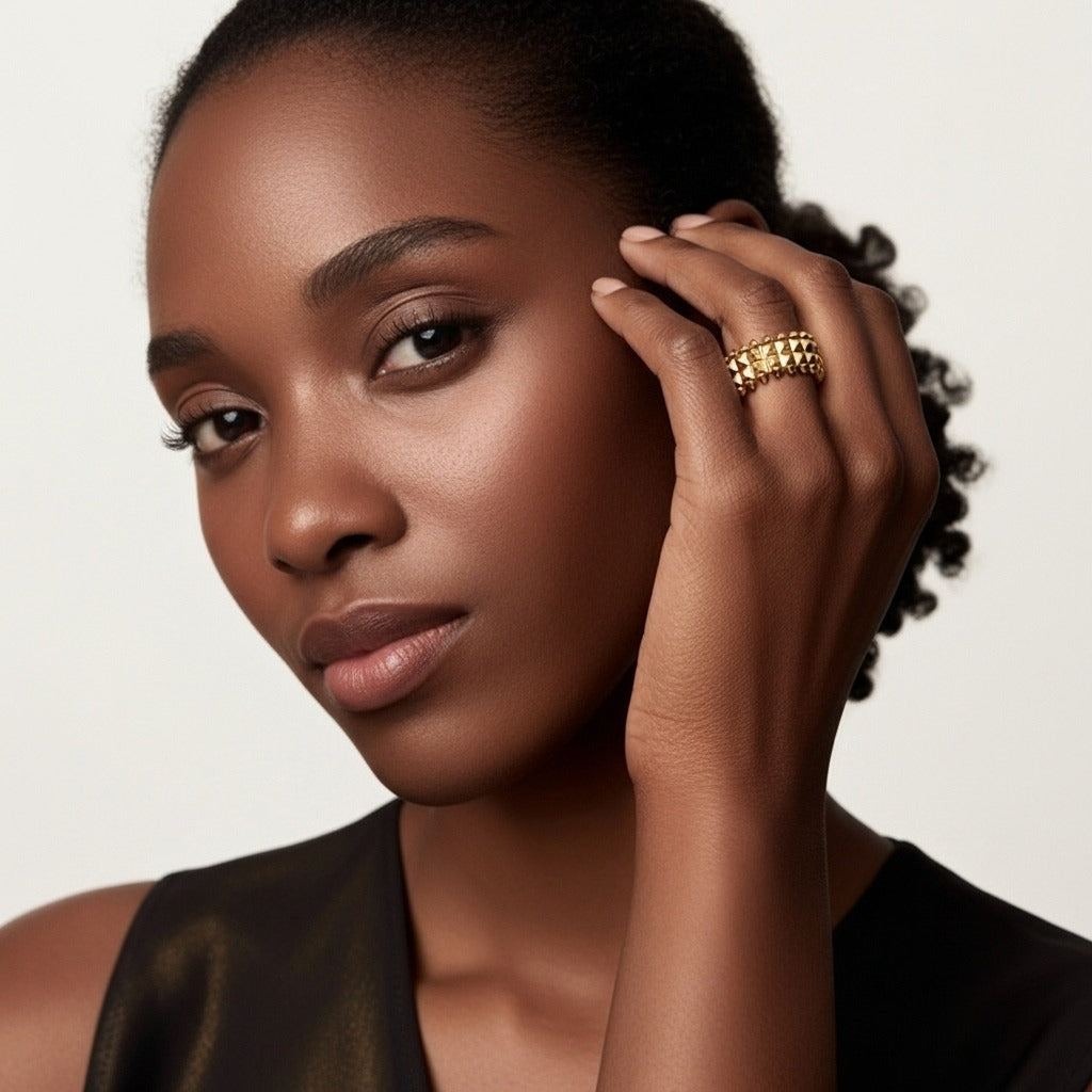 Thalisse Yüzük, 360° devam eden piramit dokusu ve kubbe uçlarıyla mimari bir siluet verir. Parlatılmış yüzeyler ışığı keskin yansıtır, her harekette güçlü bir ritim oluşturur. Dengeli yüksekliği ve iç kavisli bandı parmakta konforlu oturur. Tek başına karakterli bir odak, ince bantlarla eşlendiğinde modern bir stack etkisidir. Zamansız, güçlü ve net.